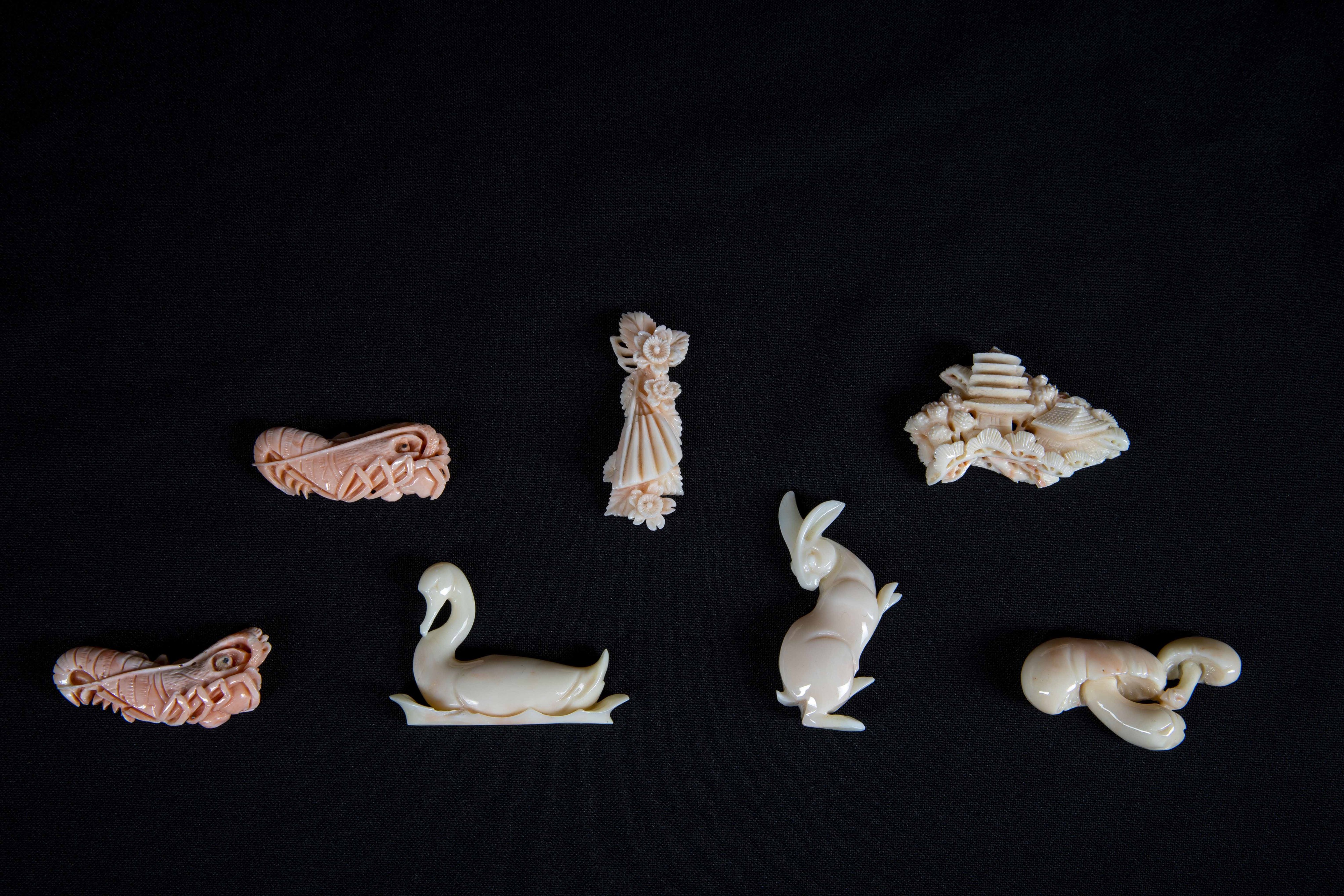 Lotto composto da sette piccoli gruppi scolpiti in corallo raffiguranti animali, Cina, inizi XX secolo