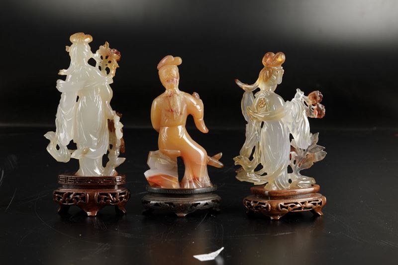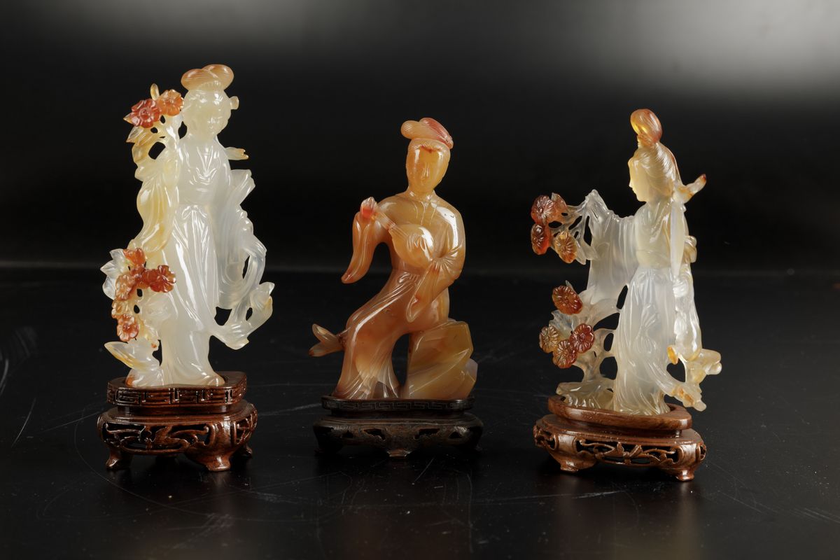 Lotto composto da tre figure di cortigiane scolpite in agata, Cina, XX secolo