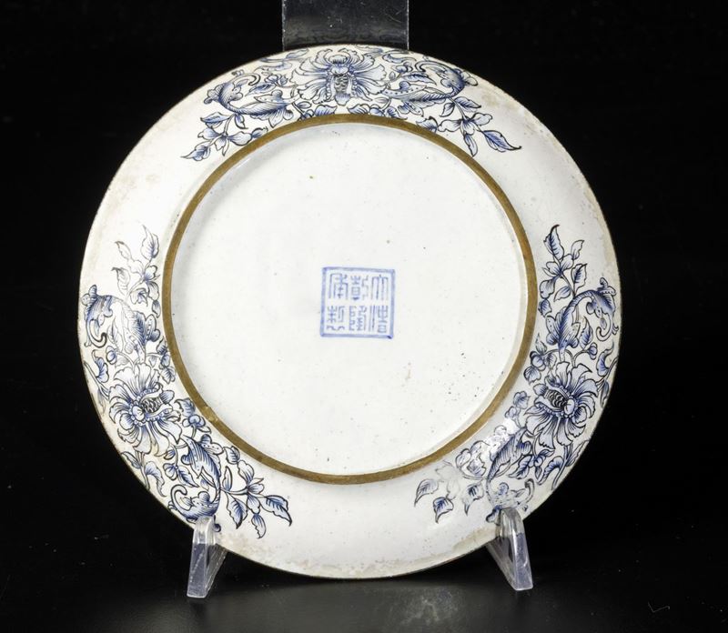 Piccolo piatto in smalto con scena di vita comune e decori floreali, Cina, Dinastia Qing, XIX secolo