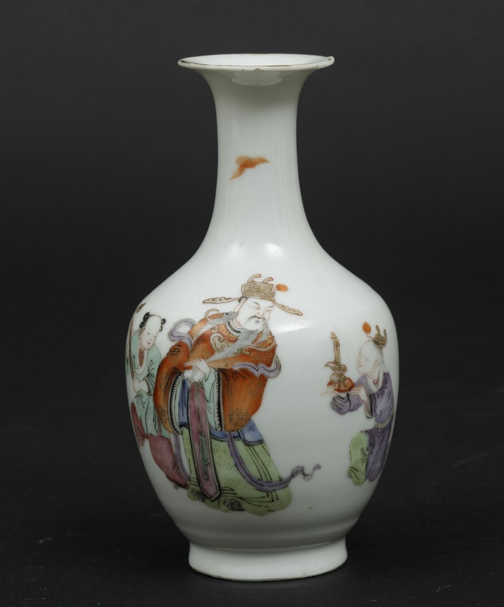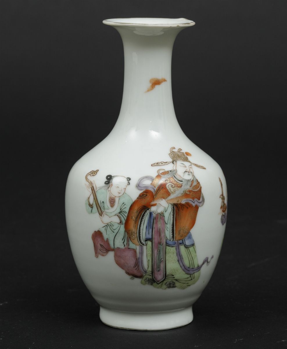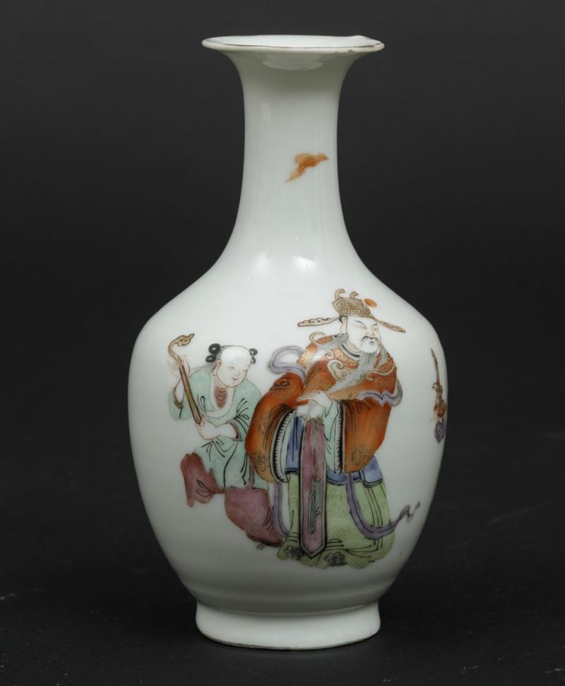 Piccolo vaso a bottiglia in porcellana a smalti policromi con figura di imperatore, Cina, XX secolo