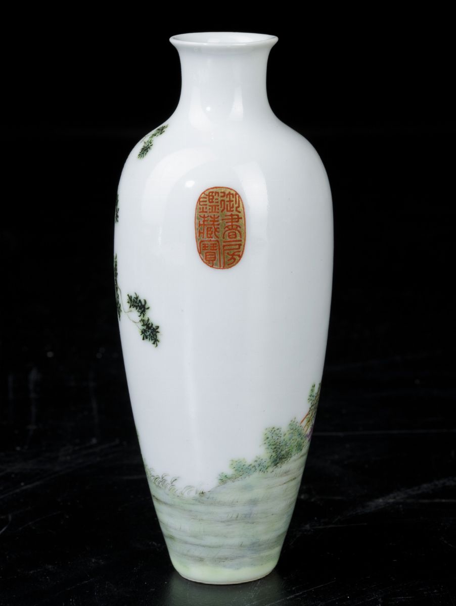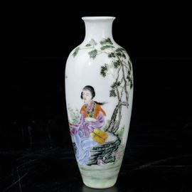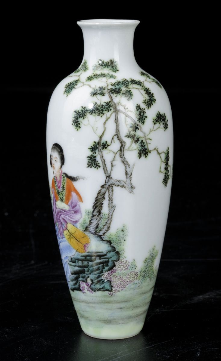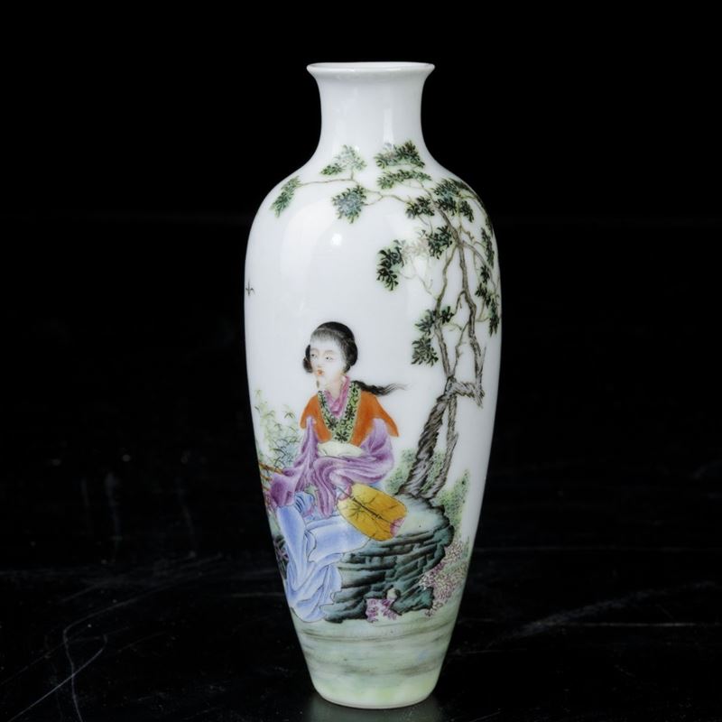 Piccolo vaso in porcellana con figura di fanciulla con ventaglio seduta entro paesaggio, Cina, Dinastia Qing, XIX secolo