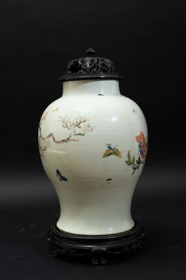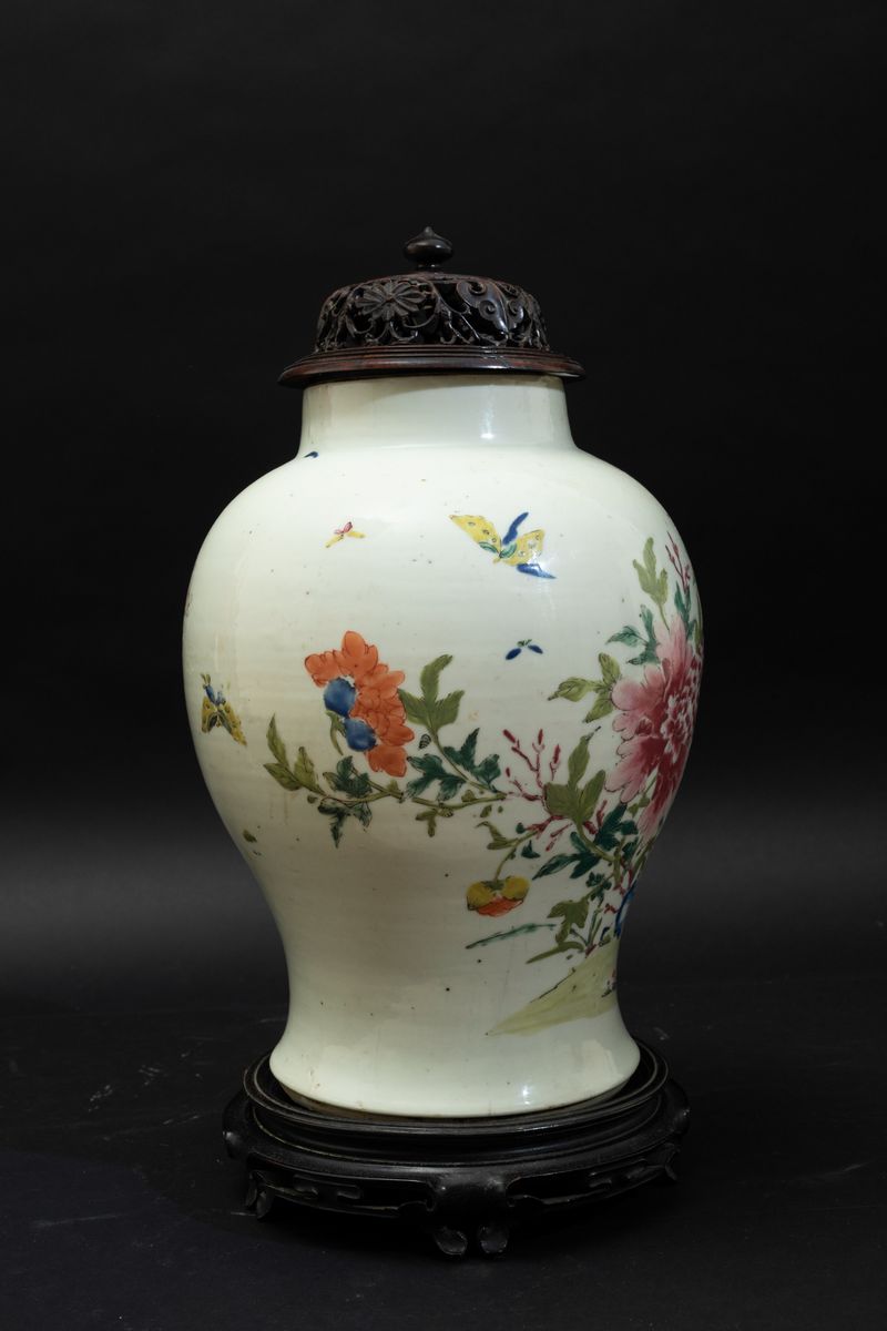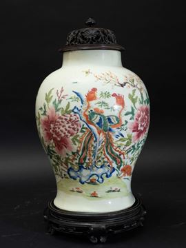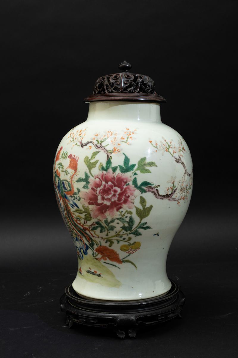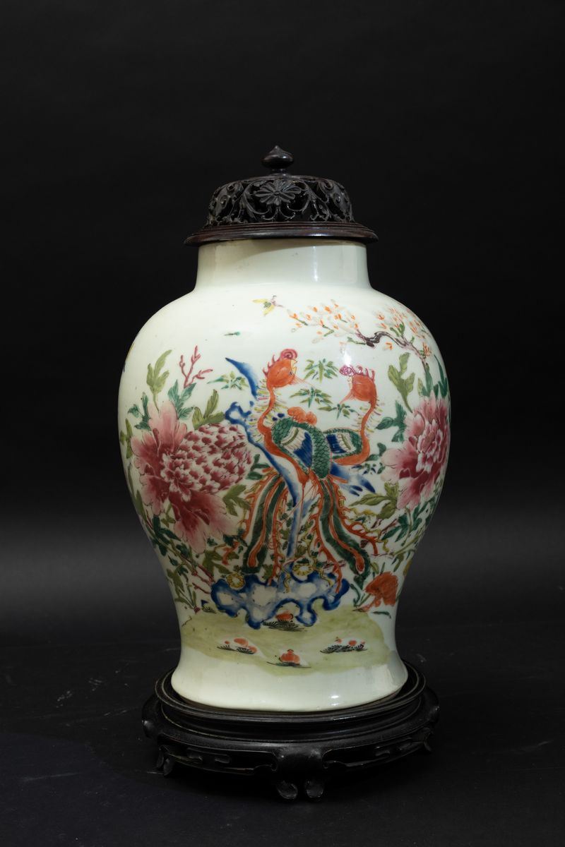 Potiche in porcellana Famiglia Rosa con coperchio in legno e decoro naturalistico con fenici e peonie, Cina, Dinastia Qing, [..]