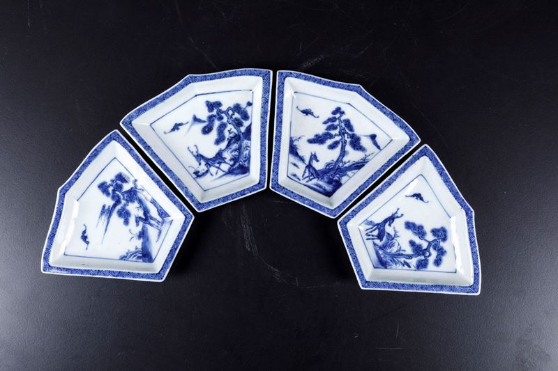 Quattro piccoli piattini sagomati in porcellana bianca e blu con figure di cerbiatti entro paesaggio, Cina, Dinastia Qing, [..]