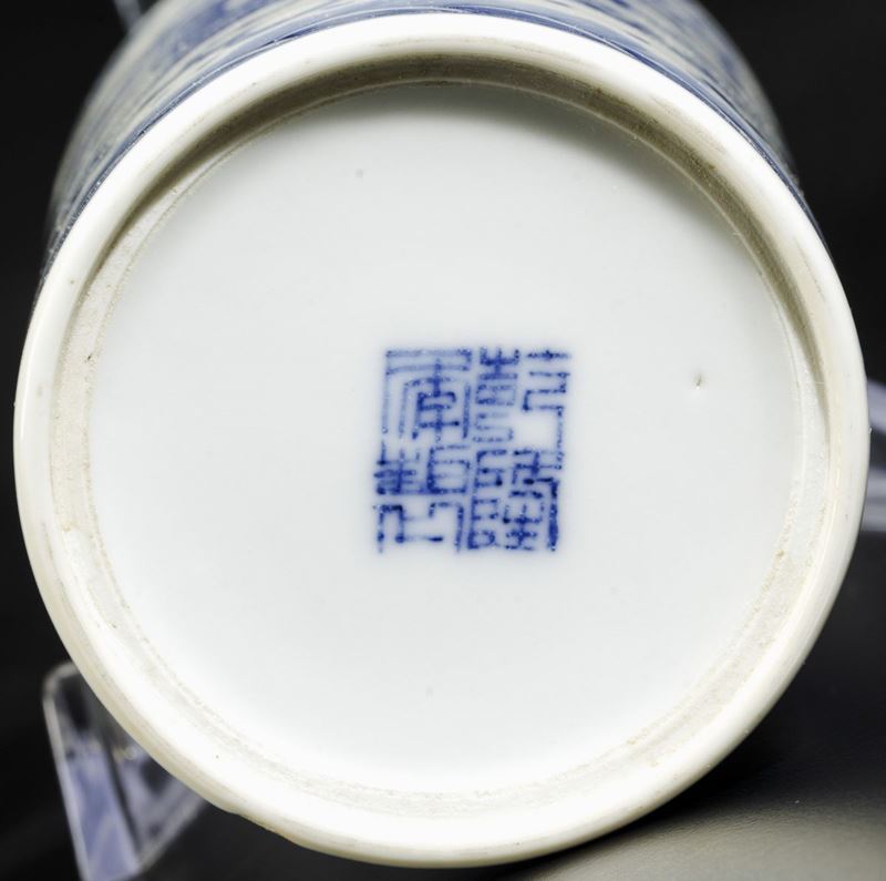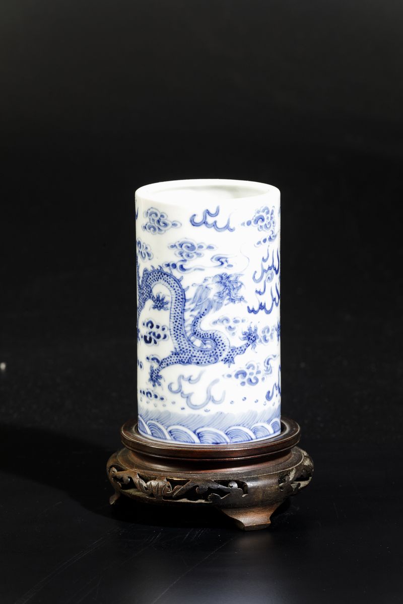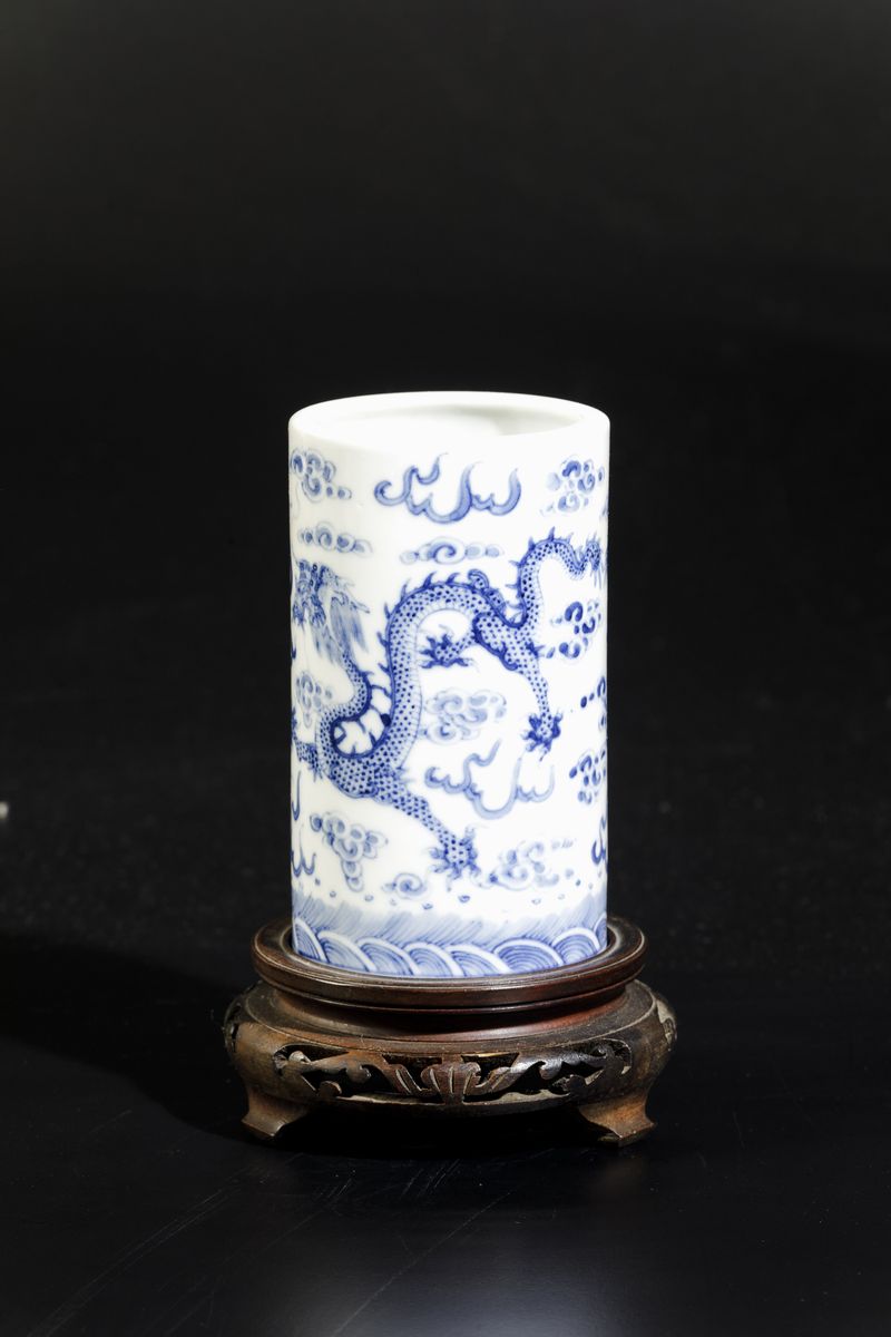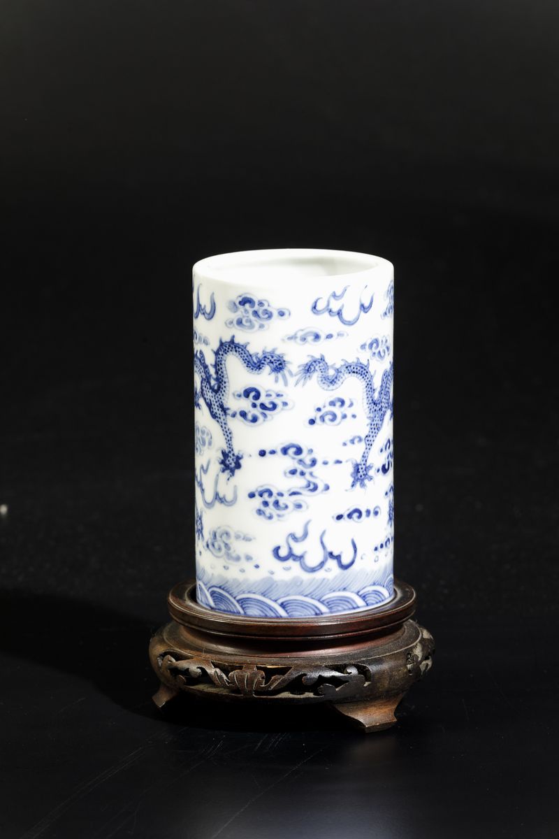 Sciacquapennelli cilindrico in porcellana bianca e blu con decoro a draghi tra le nuvole, Cina, Dinastia Qing, epoca Qianlong [..]