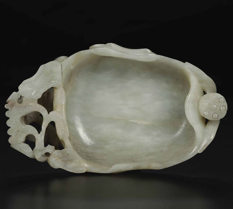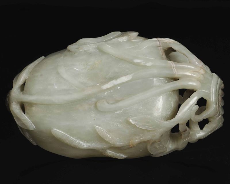 Sciacquapennelli scolpito in giada Celadon a foggia di fruttino con dettagli a rilievo, Cina, Dinastia Qing, epoca Qianlong [..]