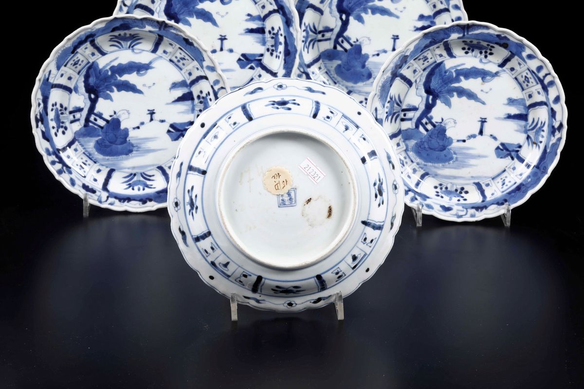 Sei piatti in porcellana bianca e blu con figure di saggi entro paesaggio e soggetti naturalistici, Cina, Dinastia Qing, epoca Kangxi (1662-1722)