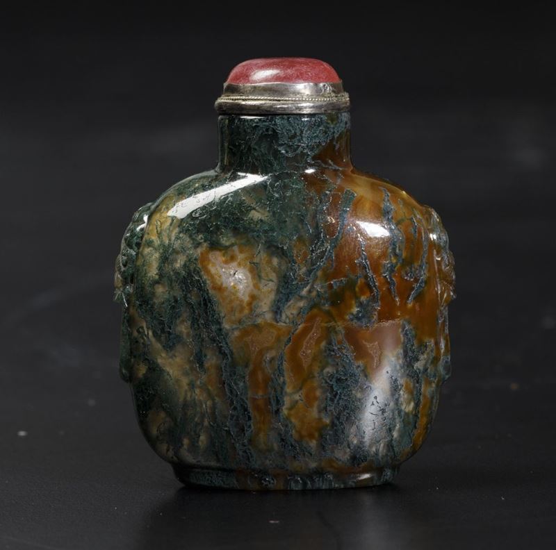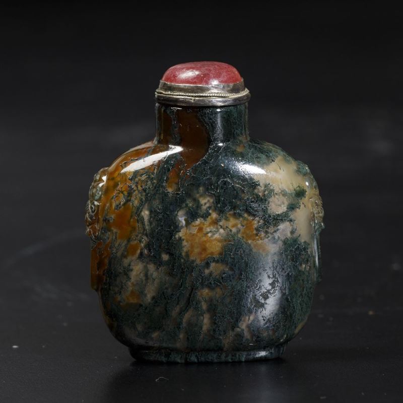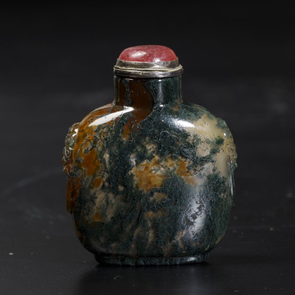 Snuff bottle in agata muschiata con mascheroni e tappo in vetro, Cina, Dinastia Qing, XIX secolo