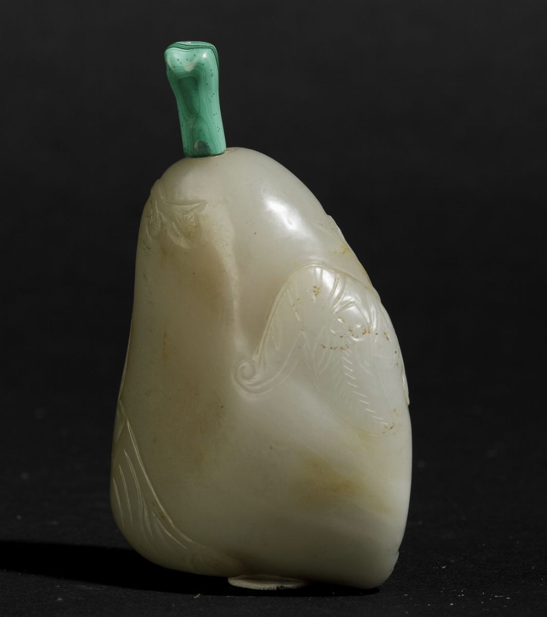 Snuff bottle in giada bianca e russet con tappo in malachite e decoro inciso raffigurante pipistrello e canne di bambù, Cina, Dinastia Qing, XIX secolo