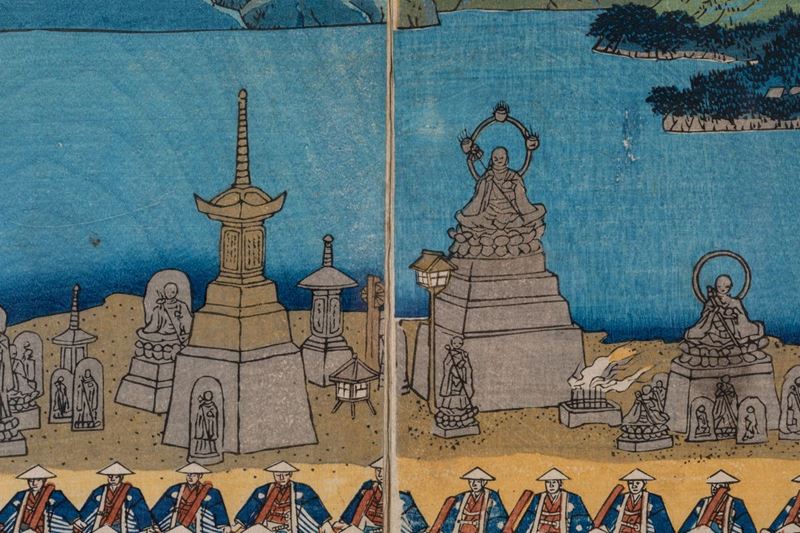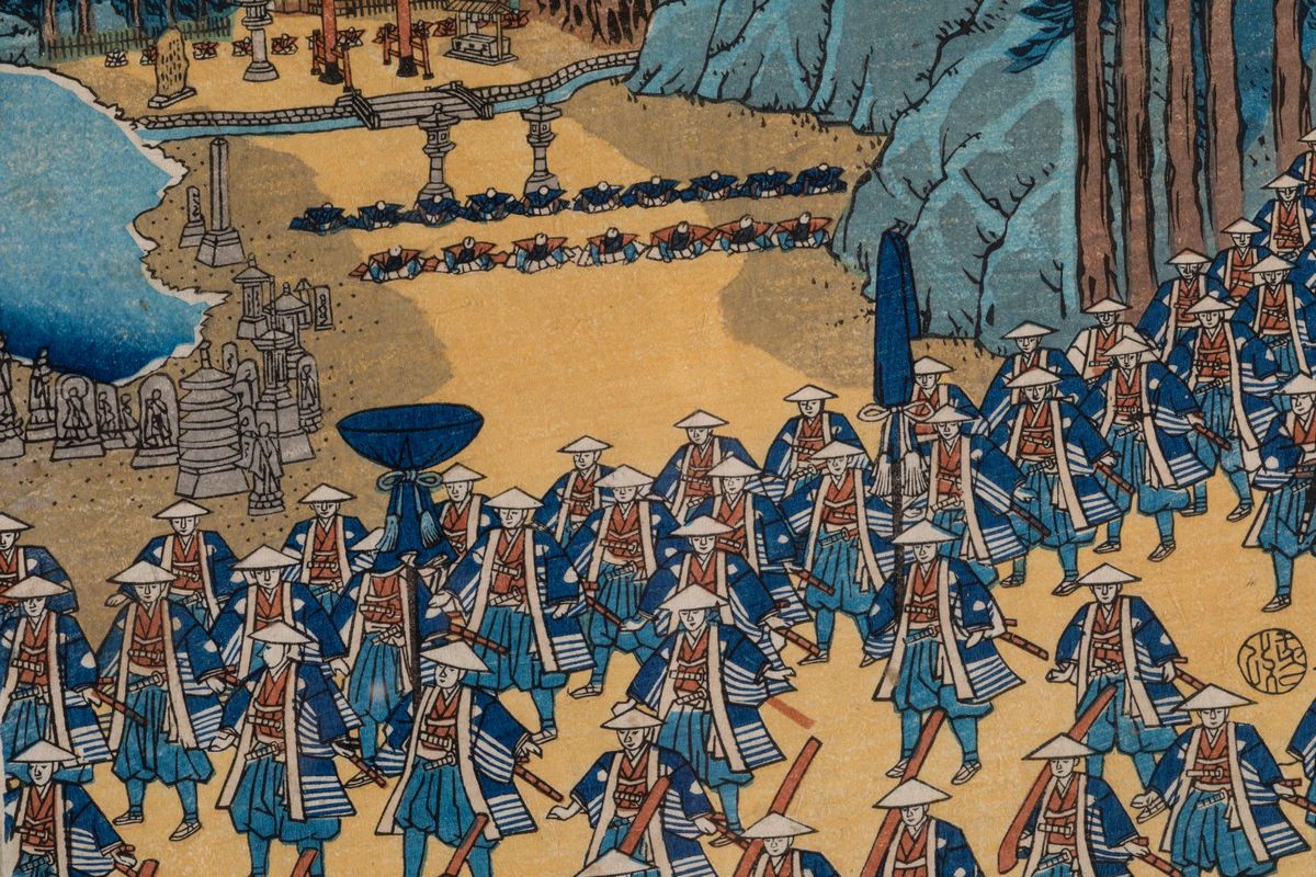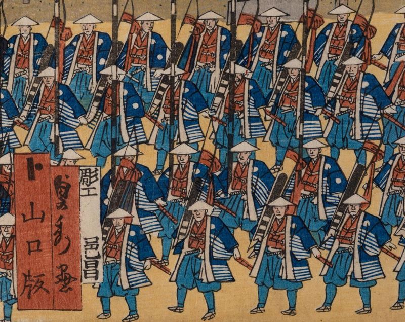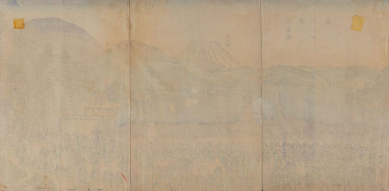 Stampa a trittico su carta raffiguranti parata e iscrizioni, Giappone, periodo Meiji (1868-1912)