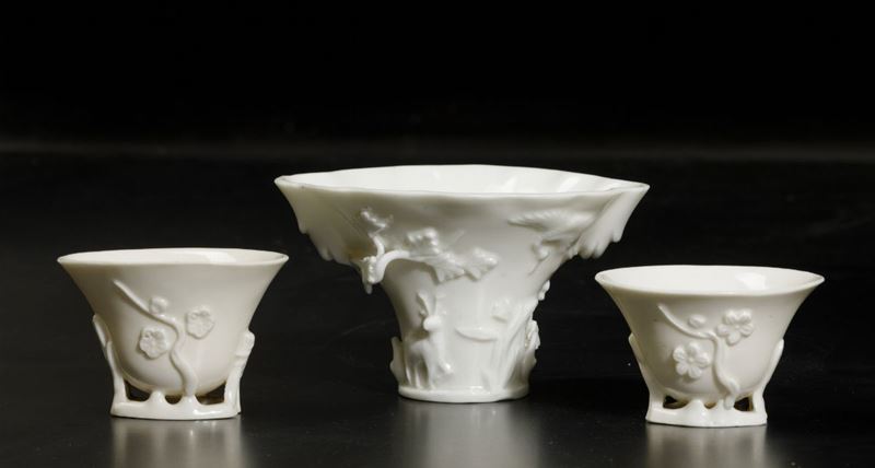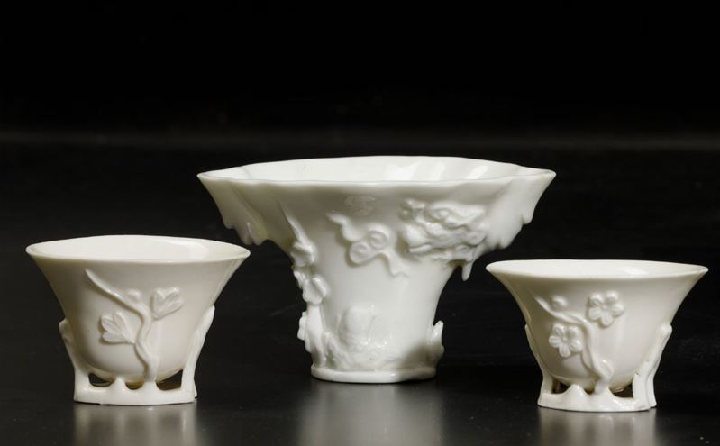 Tre coppe da libagione in porcellana Blanc de Chine Dehua con decoro a rilievo, Cina, Dinastia Qing, XVIII secolo