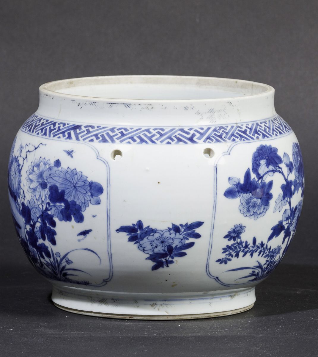 Vaso globulare in porcellana bianca e blu con soggetti naturalistici entro riserve, Cina, Dinastia Ming, epoca Kangxi (1662-1722)