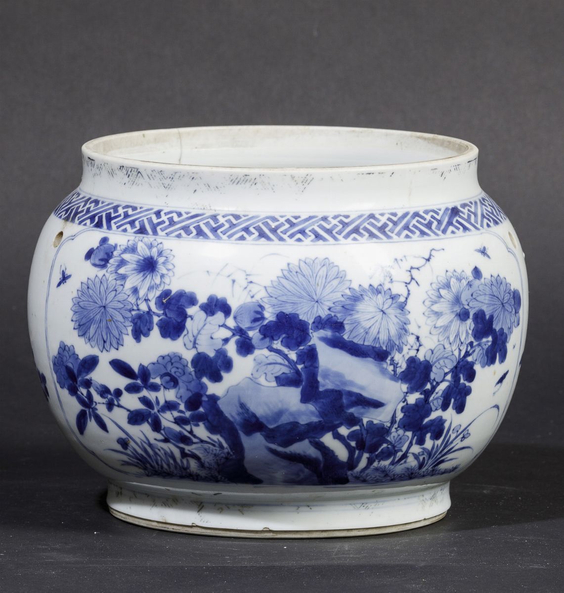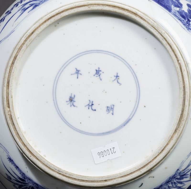 Vaso globulare in porcellana bianca e blu con soggetti naturalistici entro riserve, Cina, Dinastia Ming, epoca Kangxi (16 [..]