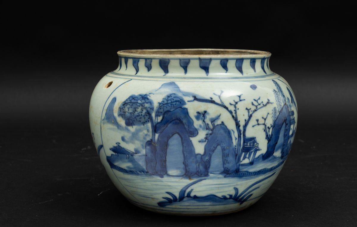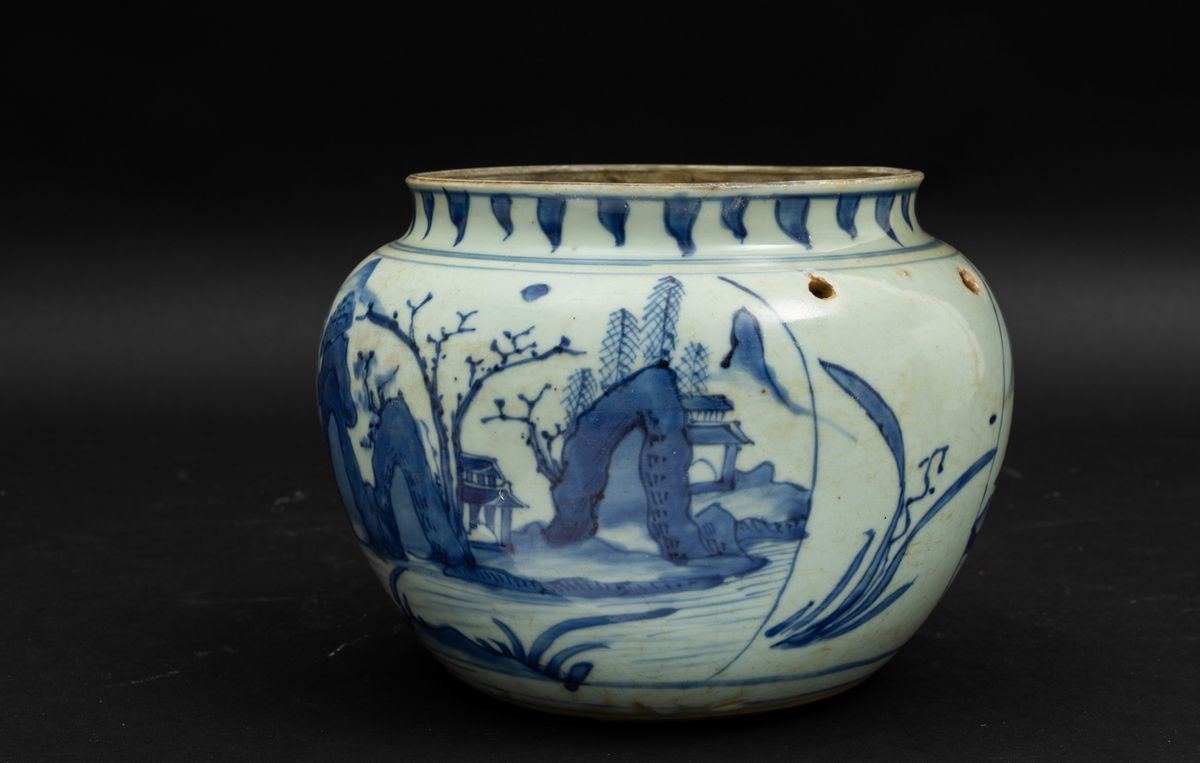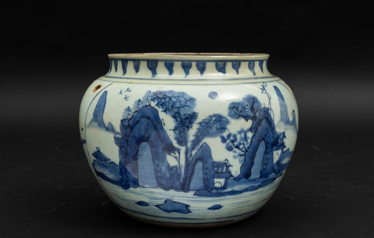 Vaso globulare in porcellana bianca e blu con paesaggio e pagode, Cina, Dinastia Qing, epoca Shunzhi (1644-1661)