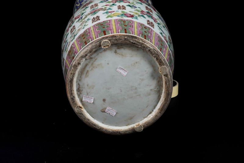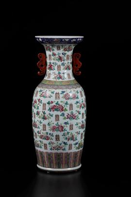 Vaso in porcellana a smalti policromi con decori floreali, simboli taoisti e anse sagomate, Cina, Dinastia Qing, XIX seco [..]
