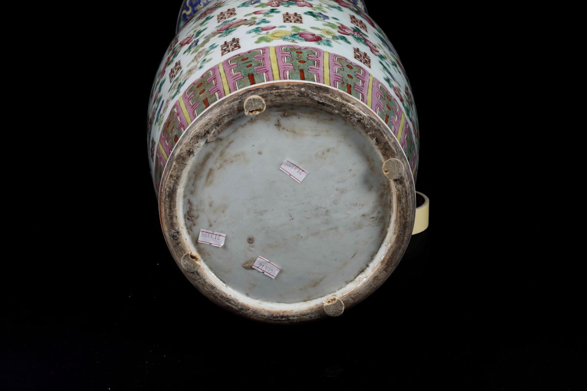 Vaso in porcellana a smalti policromi con decori floreali, simboli taoisti e anse sagomate, Cina, Dinastia Qing, XIX secolo
