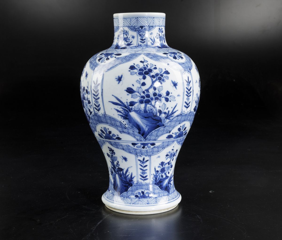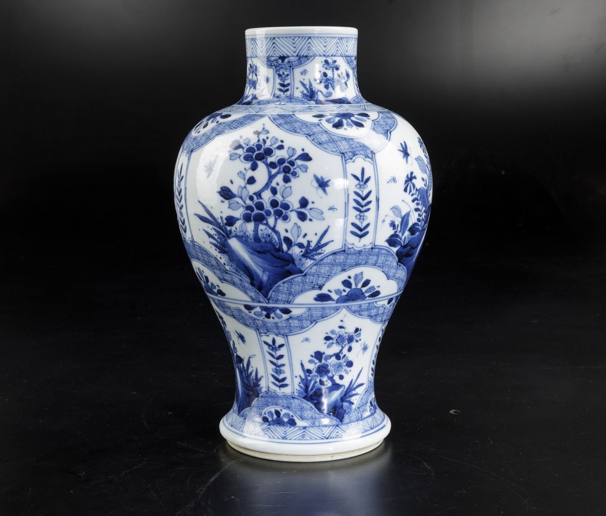 Vaso in porcellana bianca e blu con decori floreali e soggetti naturalistici entro riserve, Cina, Dinastia Qing, epoca Kangxi (1662-1722)