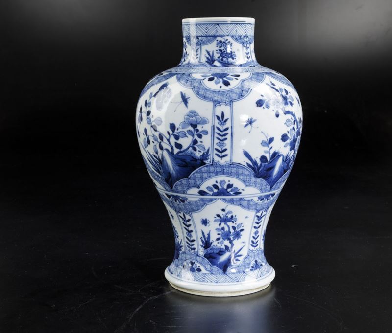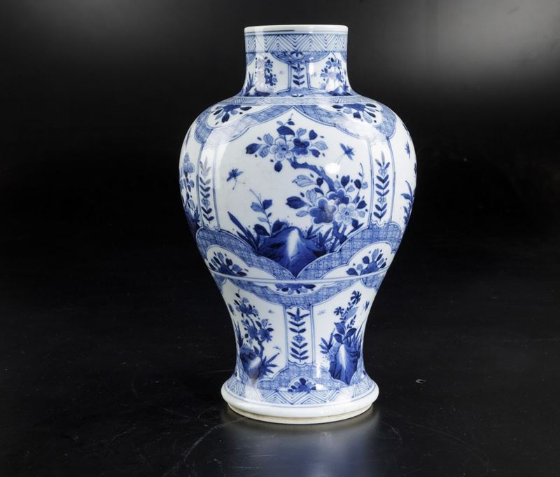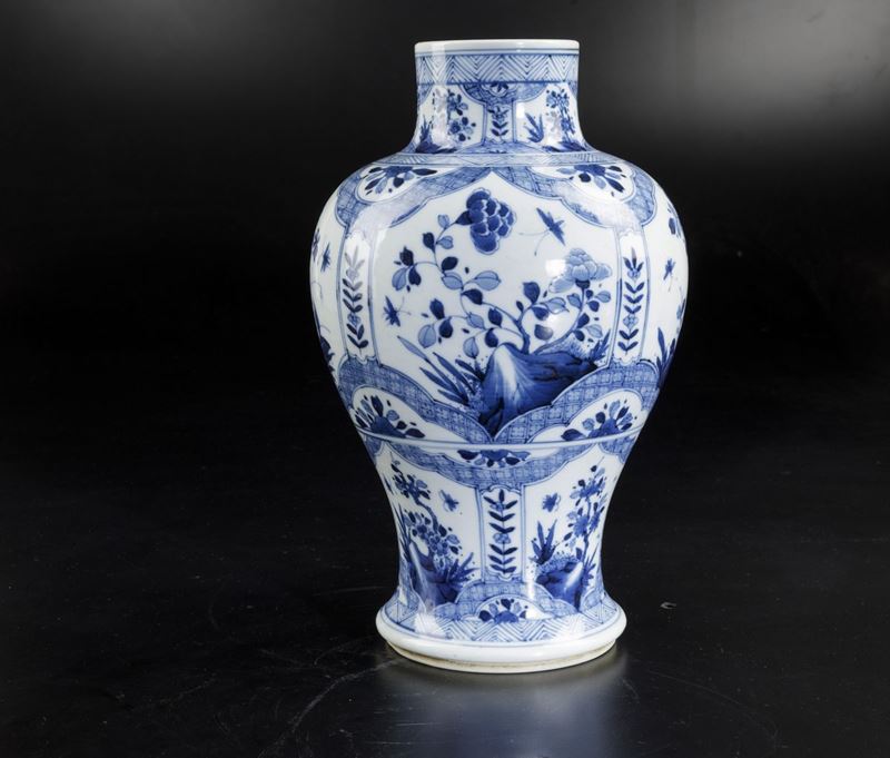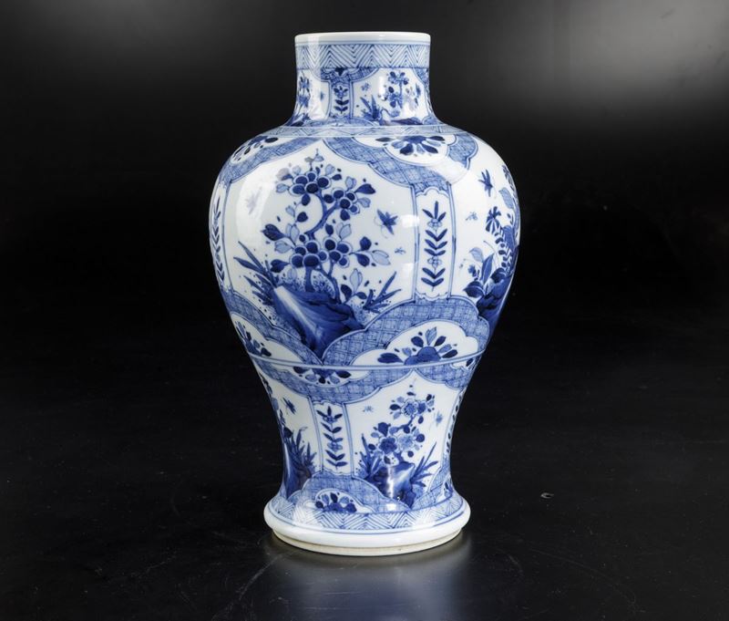 Vaso in porcellana bianca e blu con decori floreali e soggetti naturalistici entro riserve, Cina, Dinastia Qing, epoca Kangxi [..]
