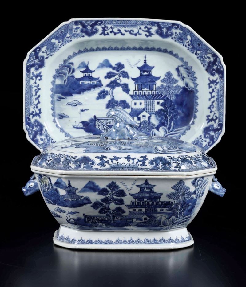Zuppiera in porcellana bianca e blu con raffigurazioni di paesaggi e decori floreali, Cina, Dinastia Qing, epoca Qianlong [..]