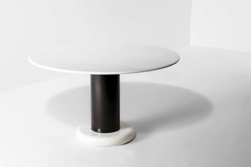 Tavolo mod. Loto Rosso con piano e base in marmo e struttura in metallo laccato.