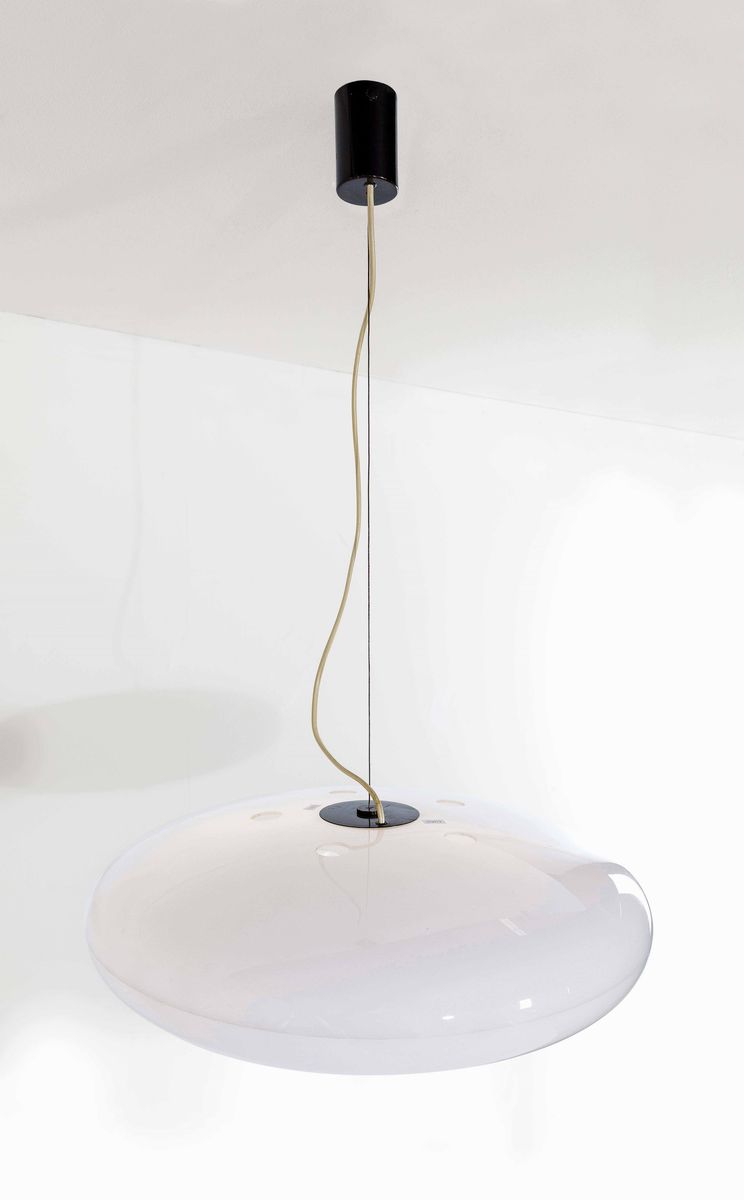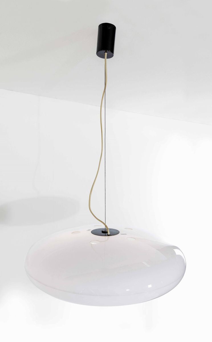 Lampada a sospensione mod. 2065G con struttura in ottone e diffusori in perspex.