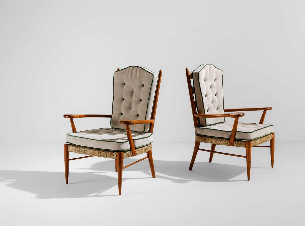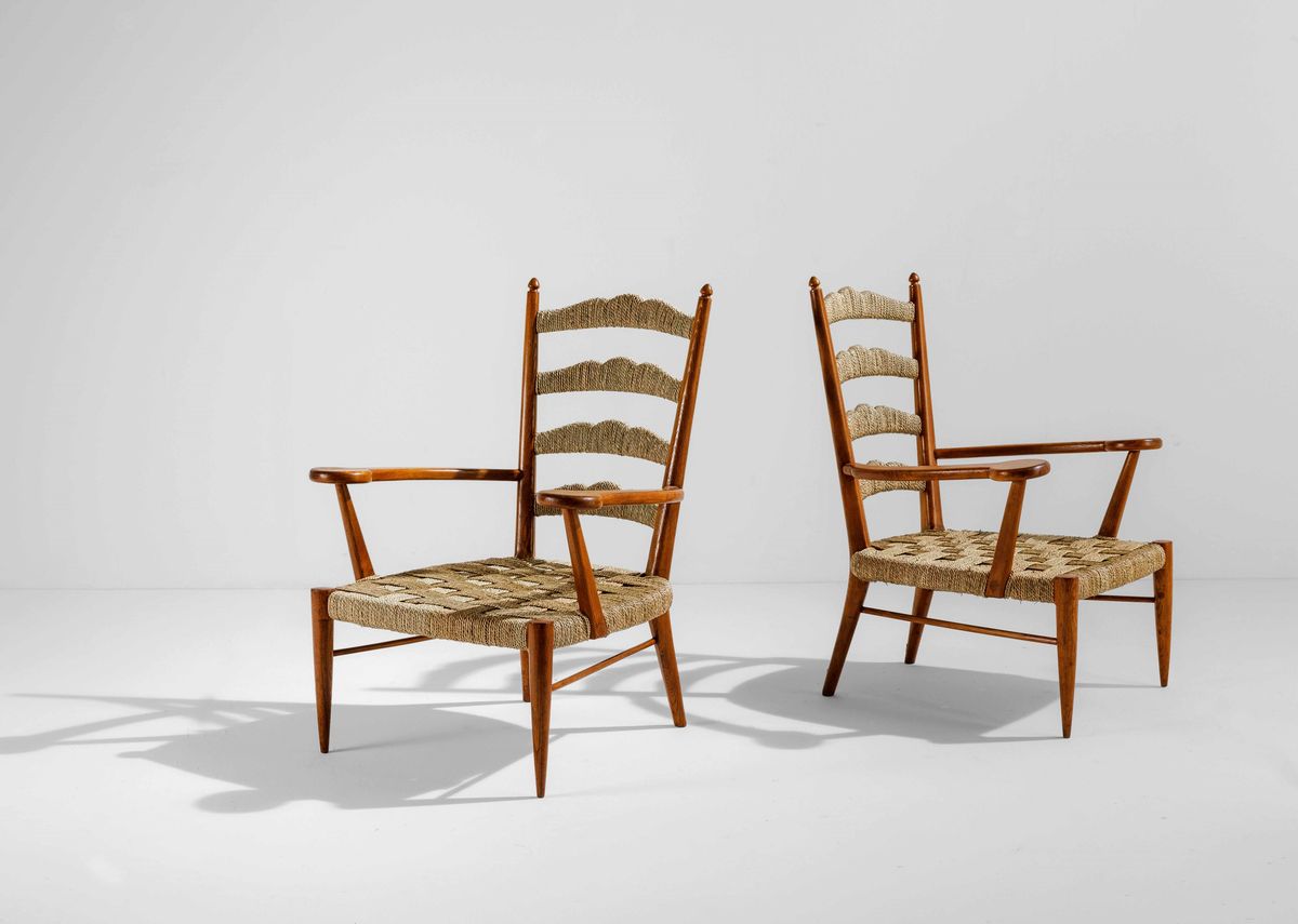 Coppia di poltrone con struttura in legno e seduta con rafia e intrecciata. Cuscini in velluto.