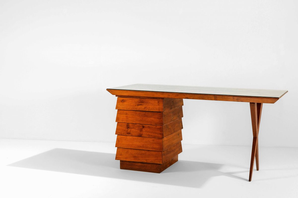 Scrivania con struttura in legno e piano in vetro.
