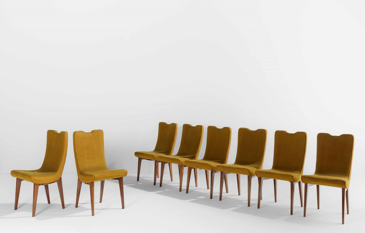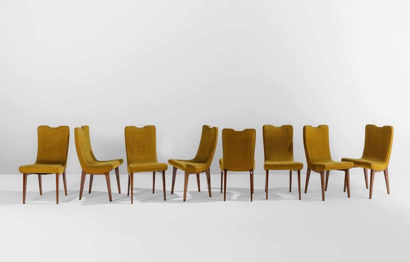 Otto sedie con struttura e sostegni in legno e rivestimenti in velluto.