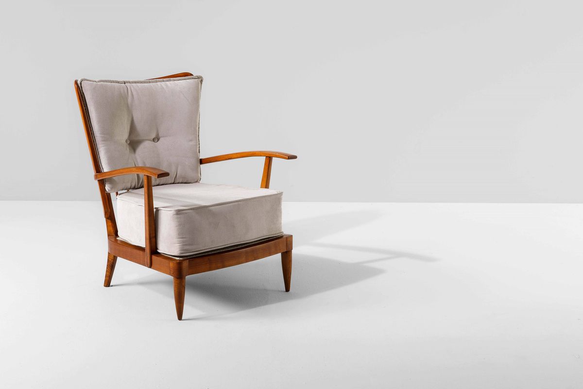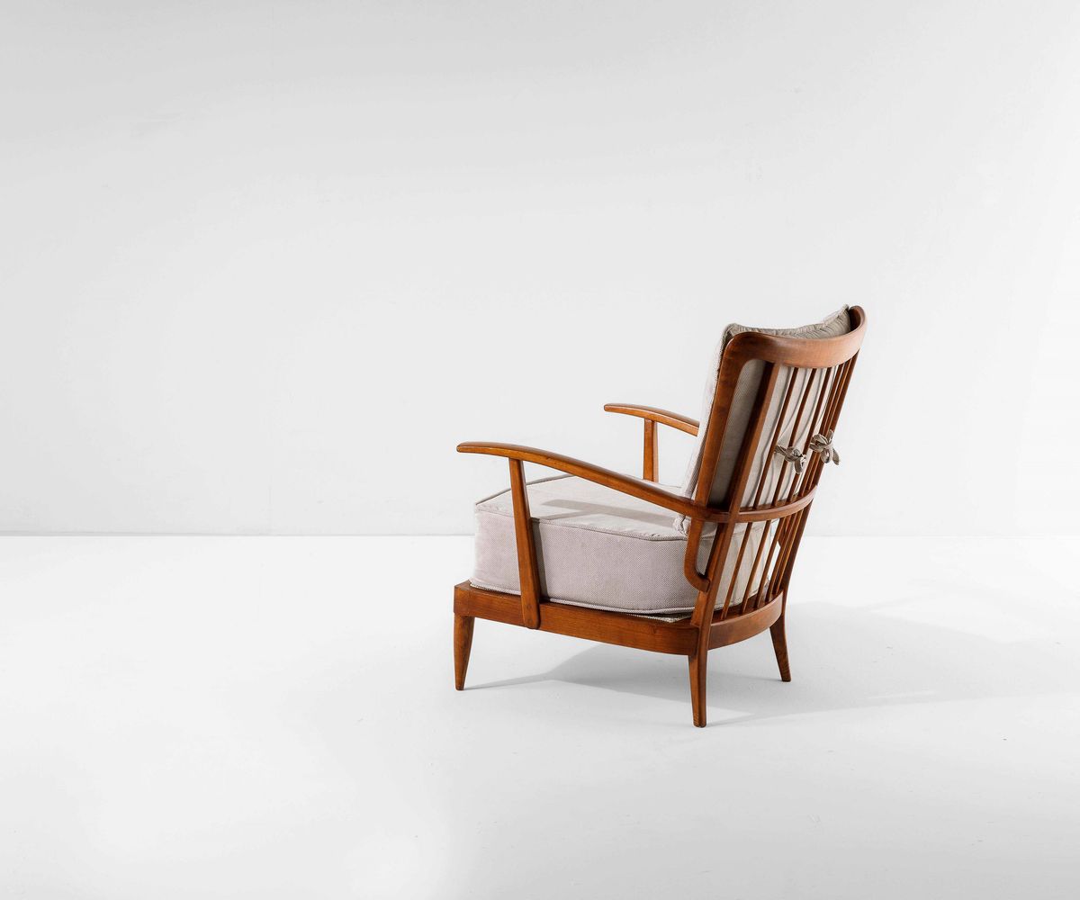 Coppia di poltrone in legno con cuscini rivestiti in tessuto.