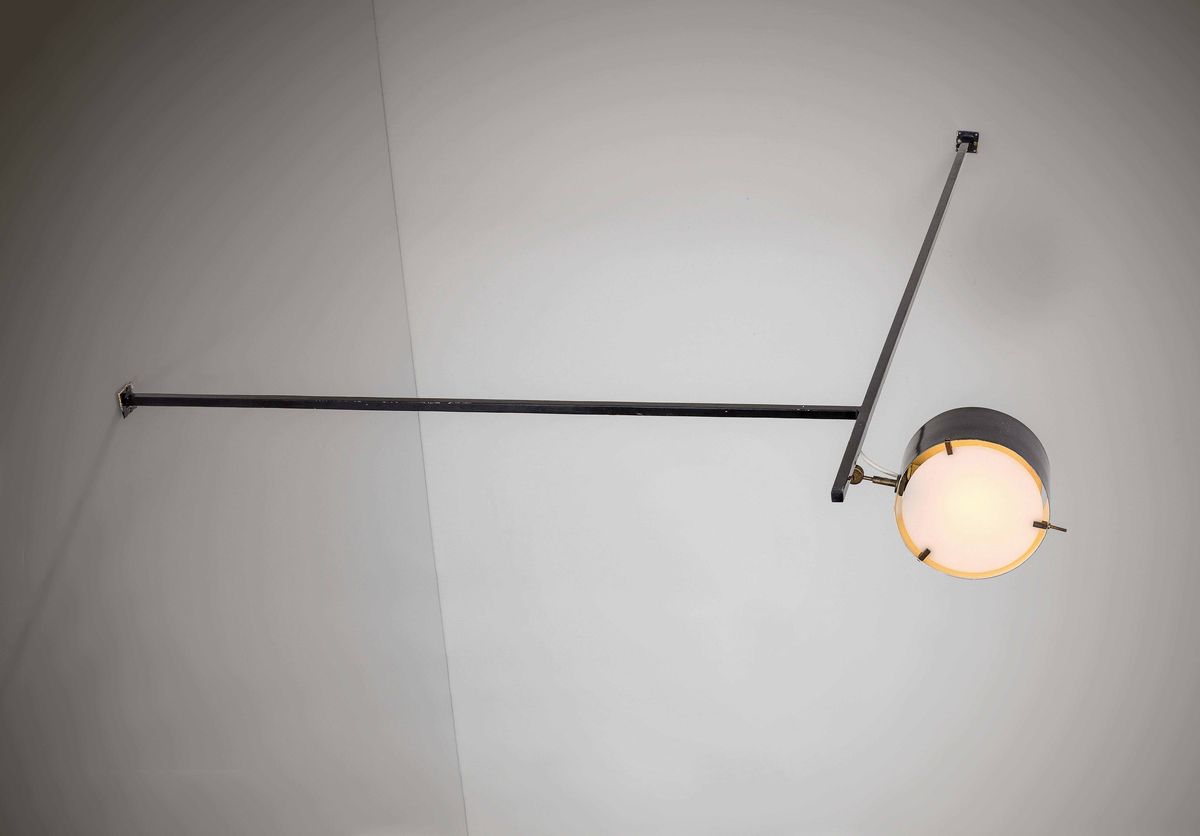 Lampada a sospensione e da parete con struttura in metallo laccato e ottone. Diffusore in vetro.