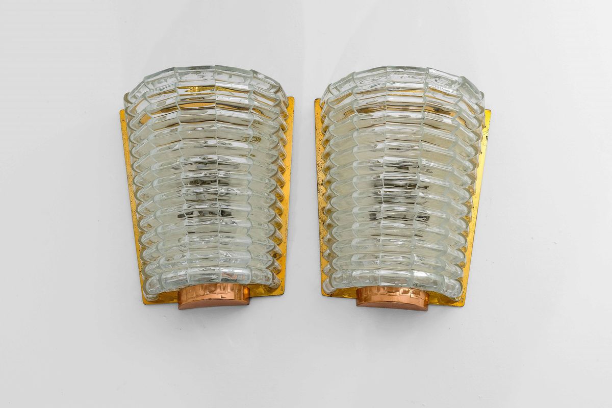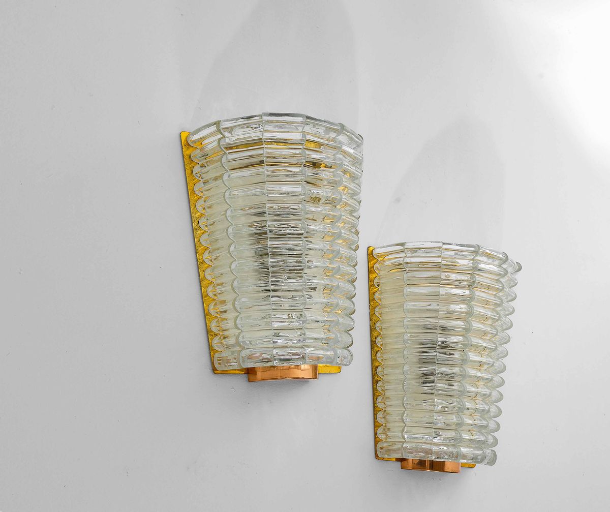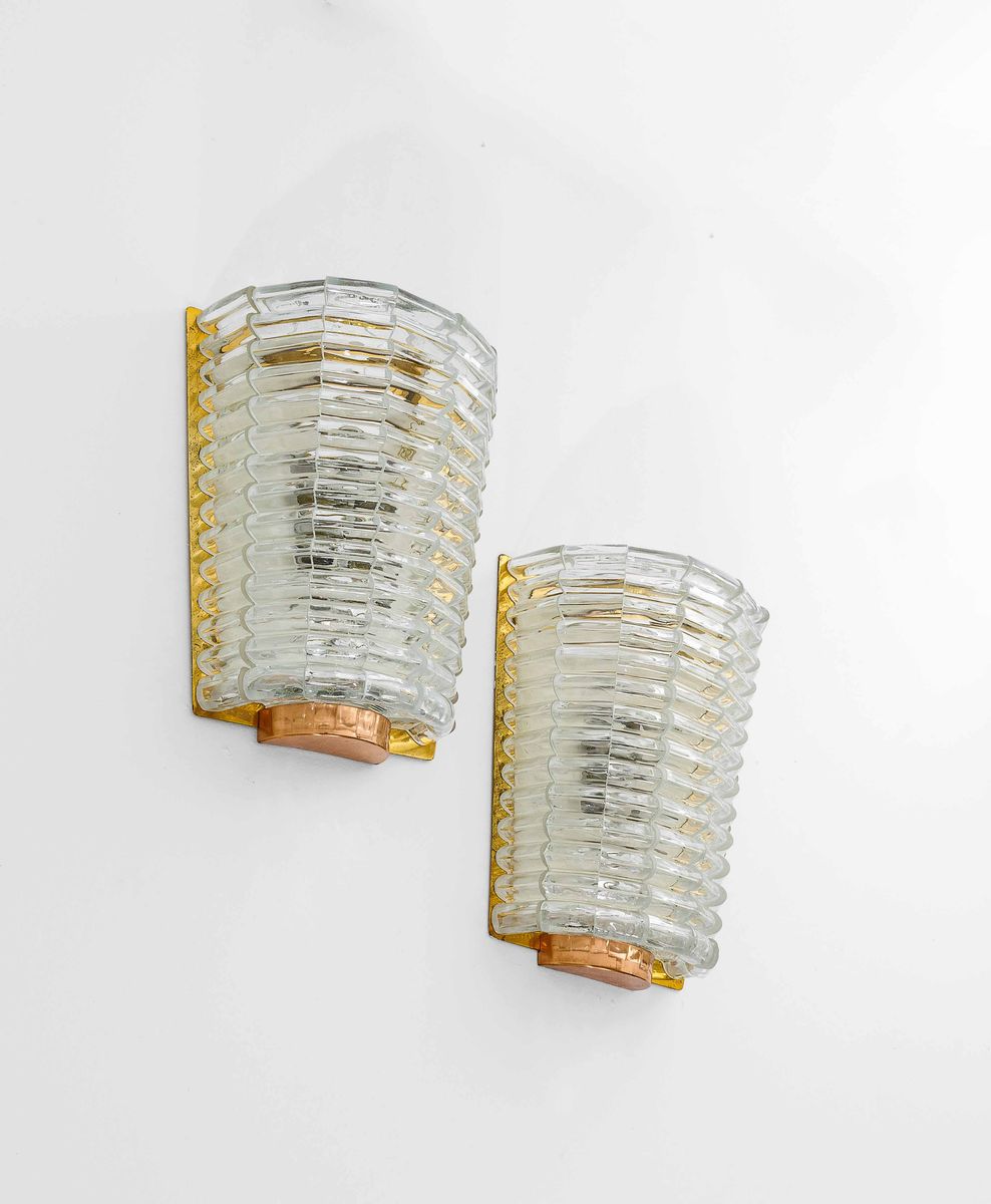 Coppia di grandi lampade da parete con struttura in ottone e rame, elementi diffusori in vetro di Murano Ondulato. Firma incussa.