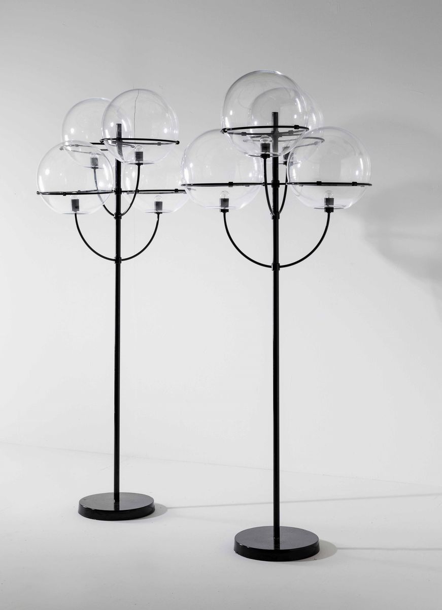 Due lampade da terra mod. Lyndon con struttura in metallo laccato. Diffusori in vetro.