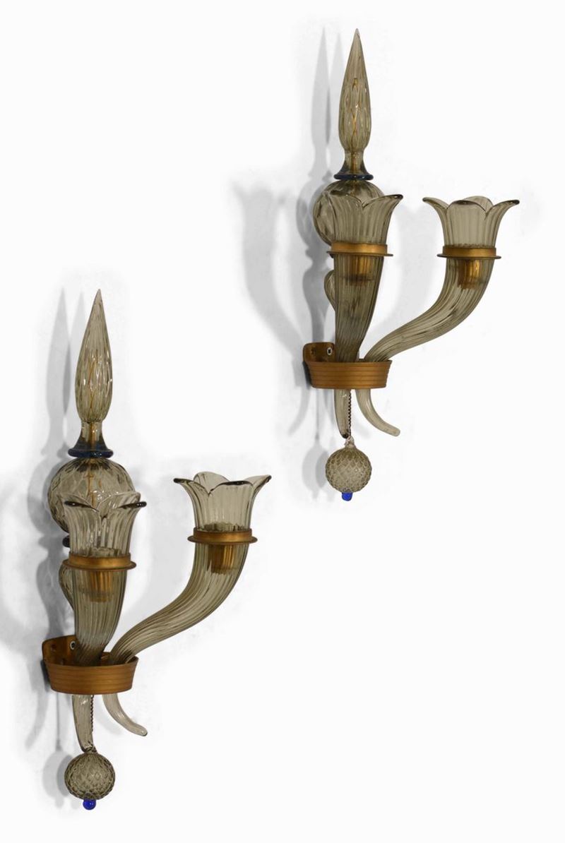 Coppia di lampade a parete con struttura in ottone e elementi in vetro di Murano.