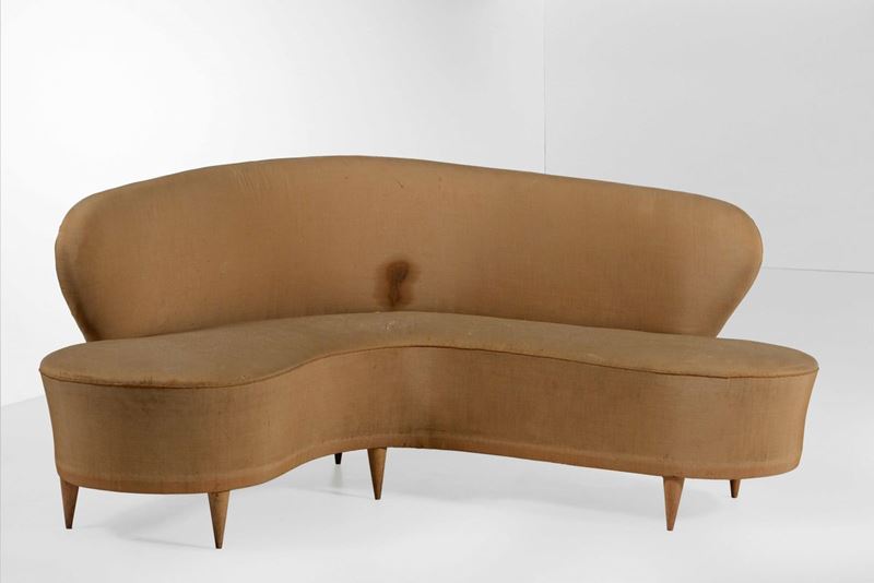 Divano curvo con struttura e sostegni in legno, rivestimento in tessuto.
