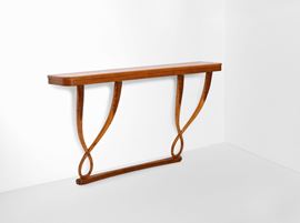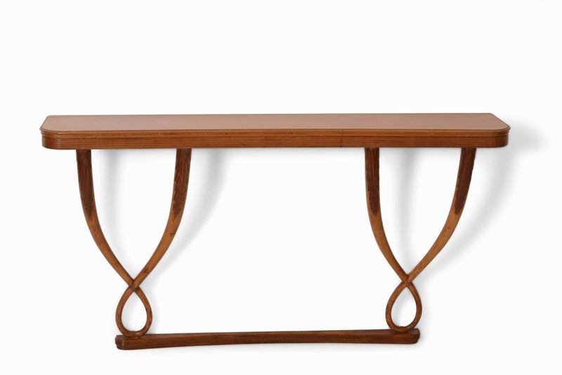Consolle in legno con struttura, sostegni e piano in legno.