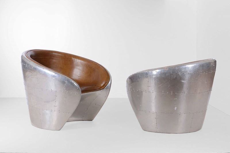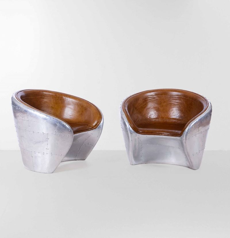 Coppia di poltrone con struttura in metallo, legno e rivestimento in pelle.