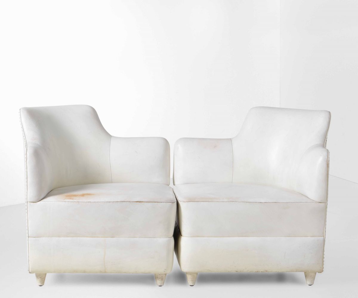 Coppia di poltrone componibili con struttura in legno, rivestimento in pelle e sostegni in legno rivestiti in pelle.