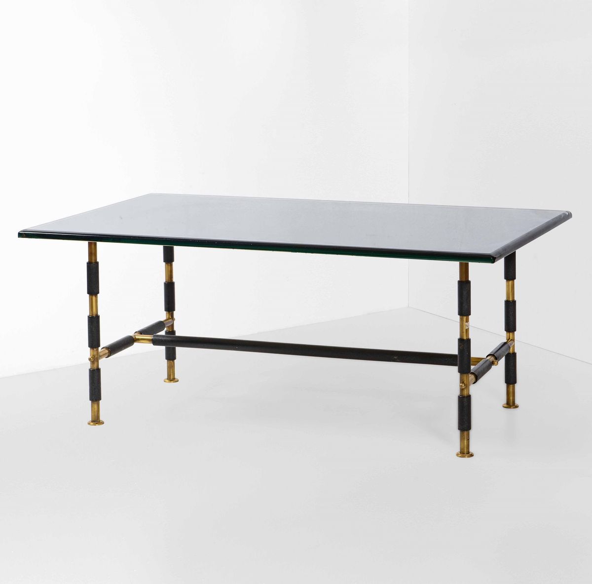 Tavolo basso con struttura in metallo laccato e ottone, piano in cristallo molato e specchiato di forte spessore.