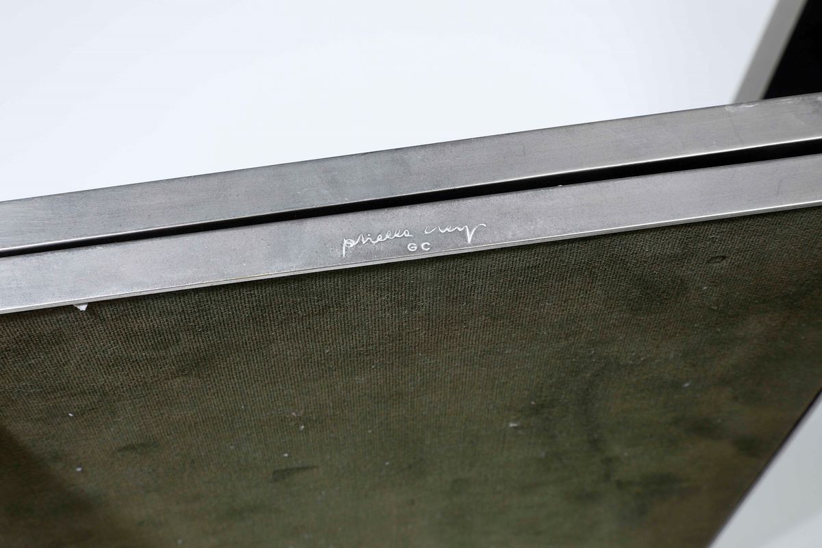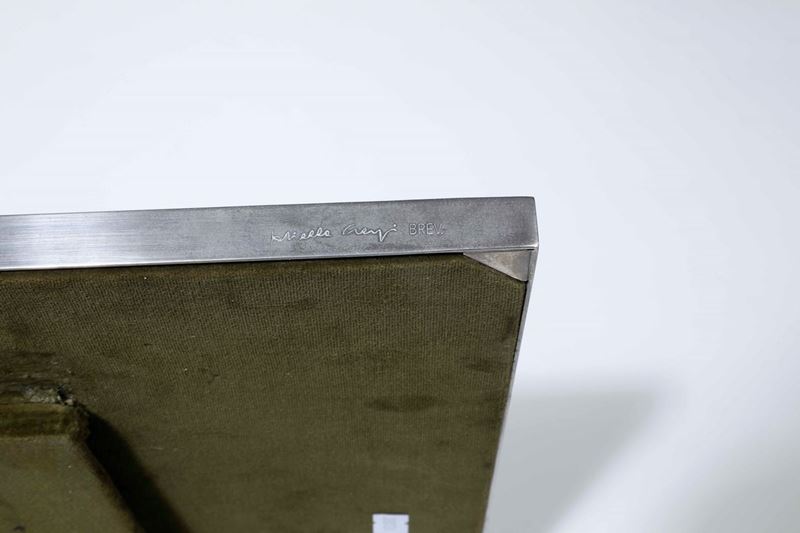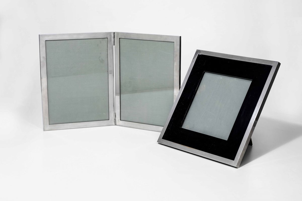 Due portafoto con cornice in ottone nichelato, tessuto e vetro.