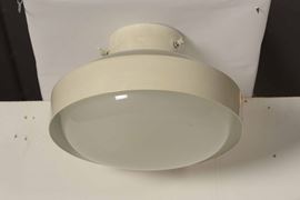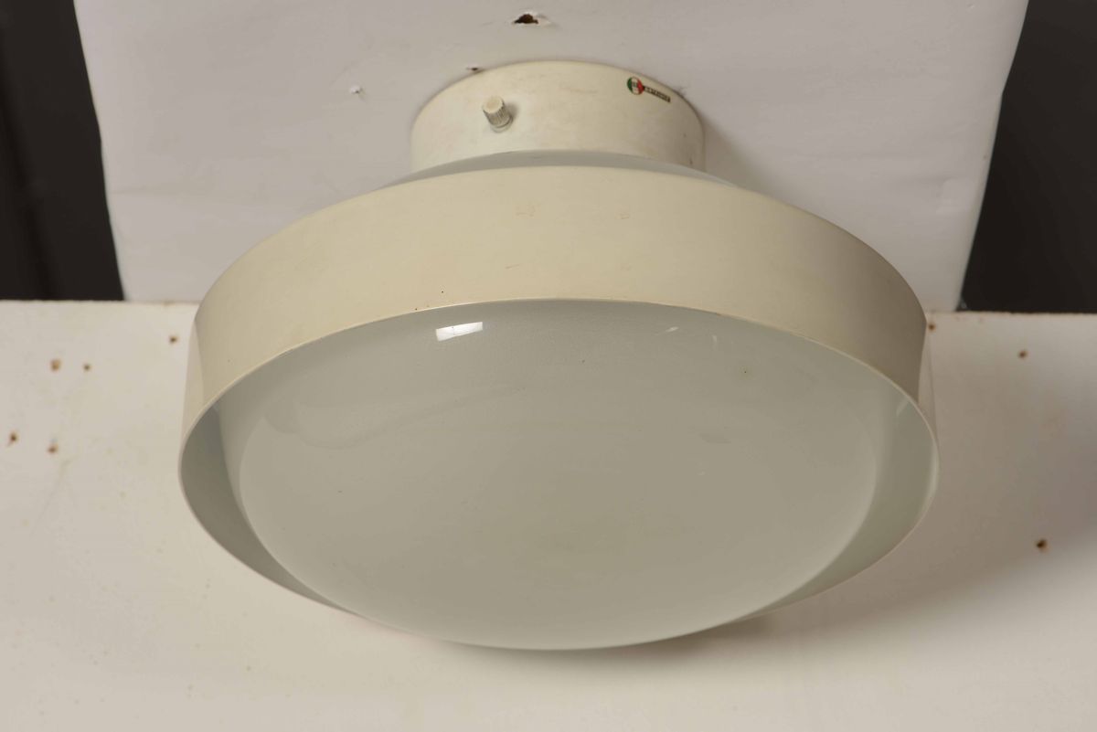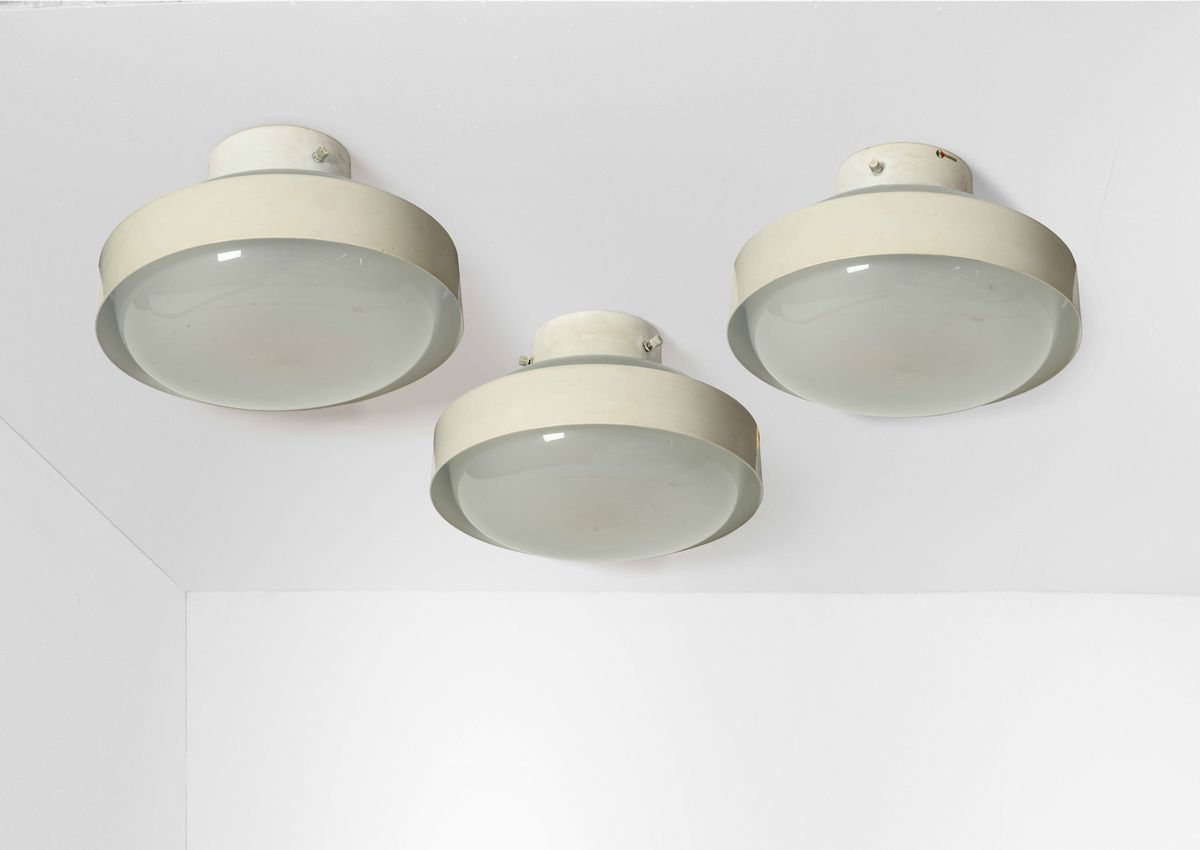 Tre lampade a plafone mod. 3010 con struttura in metallo e alluminio laccato. Diffusore in vetro satinato.