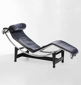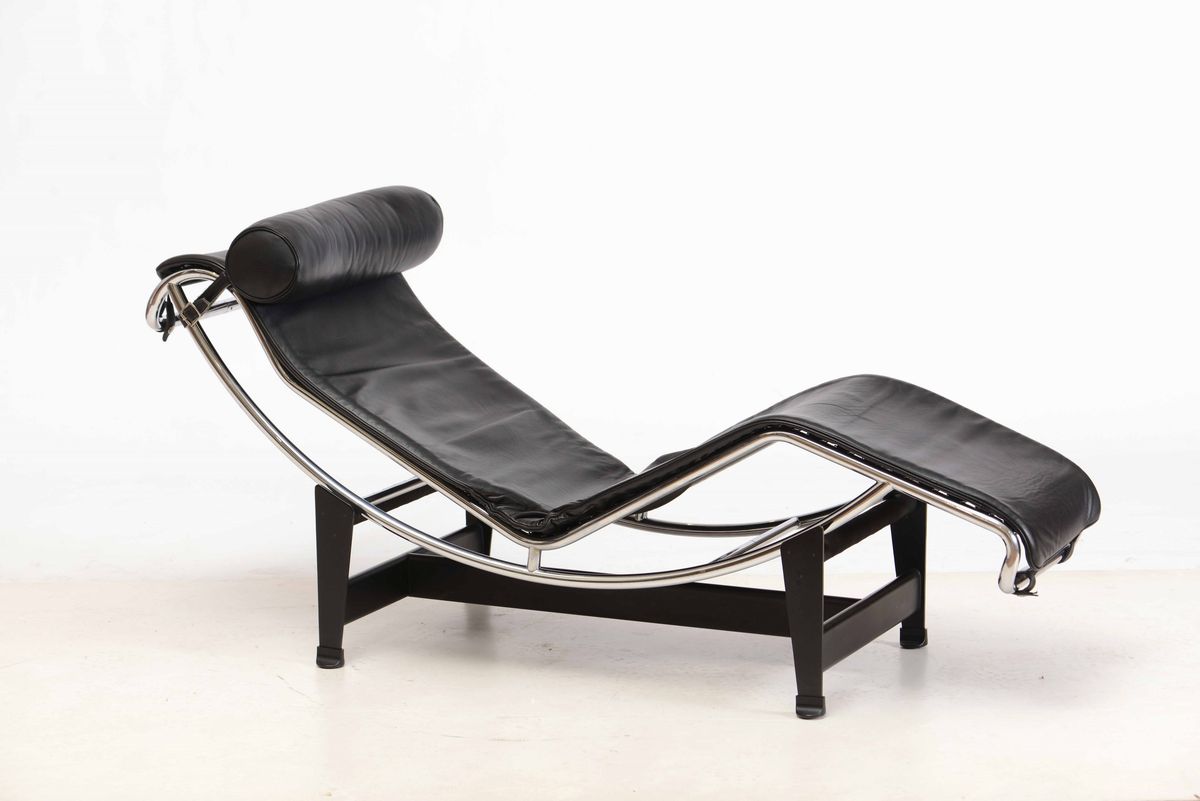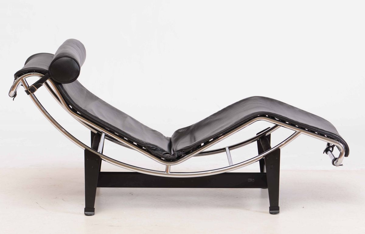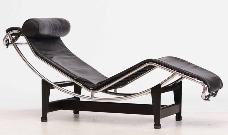 Chaise-longue a inclinazione variabile mod. LC4 con struttura in tubolare cromato, sostegni in metallo laccato e rivestimento in pelle.
