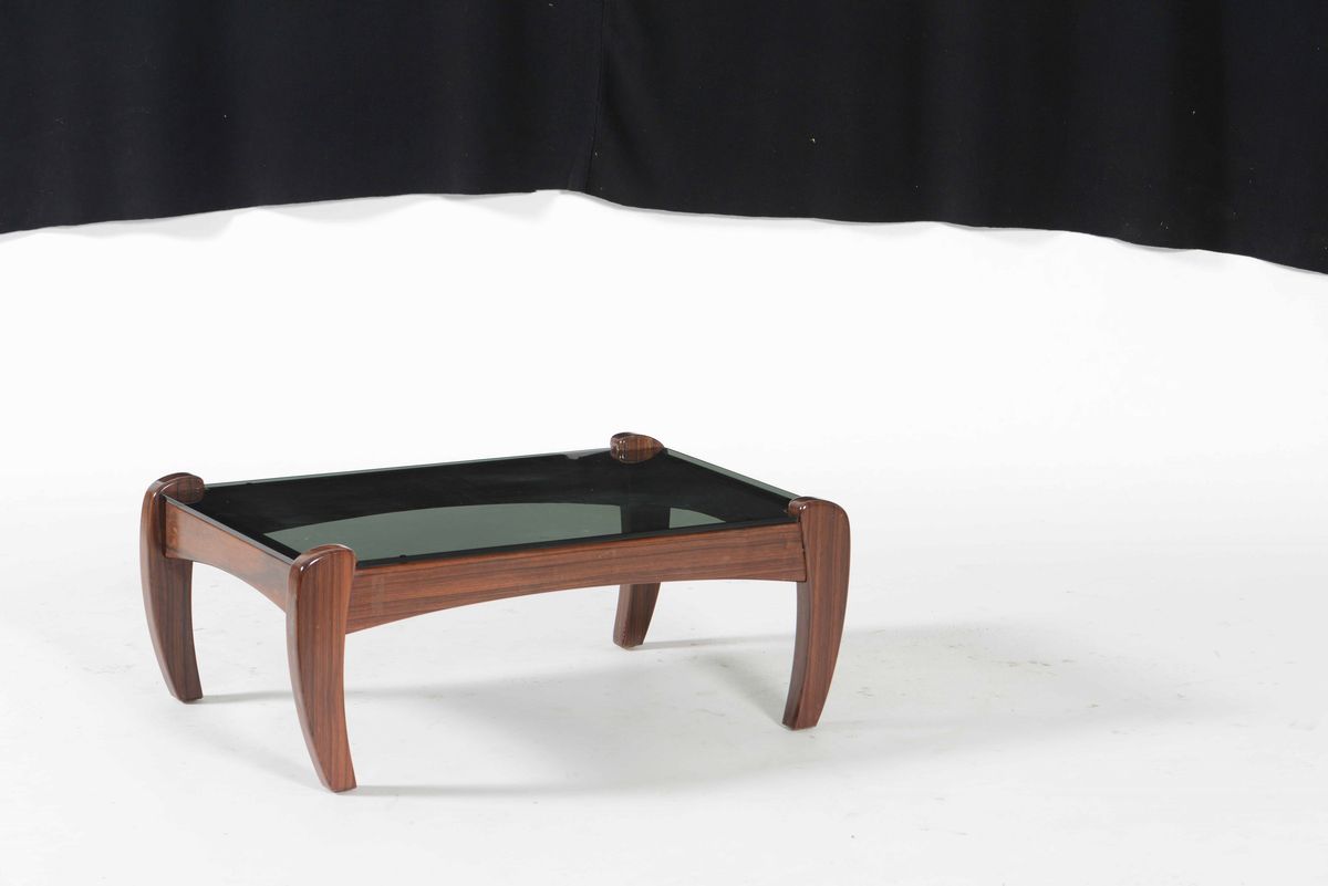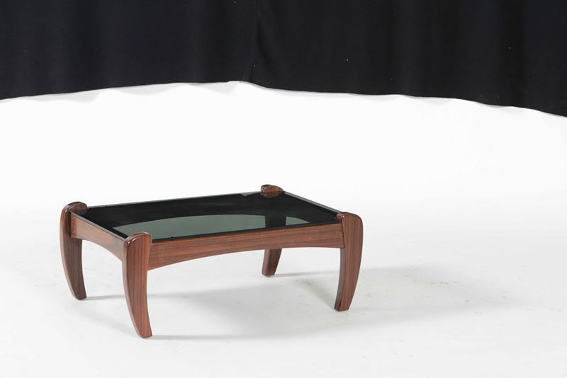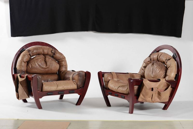 Salotto composto da divano, coppia di poltrone e tavolo basso mod. Rancero con struttura in legno e rivestimento in pelle. Piano in cristallo molato.