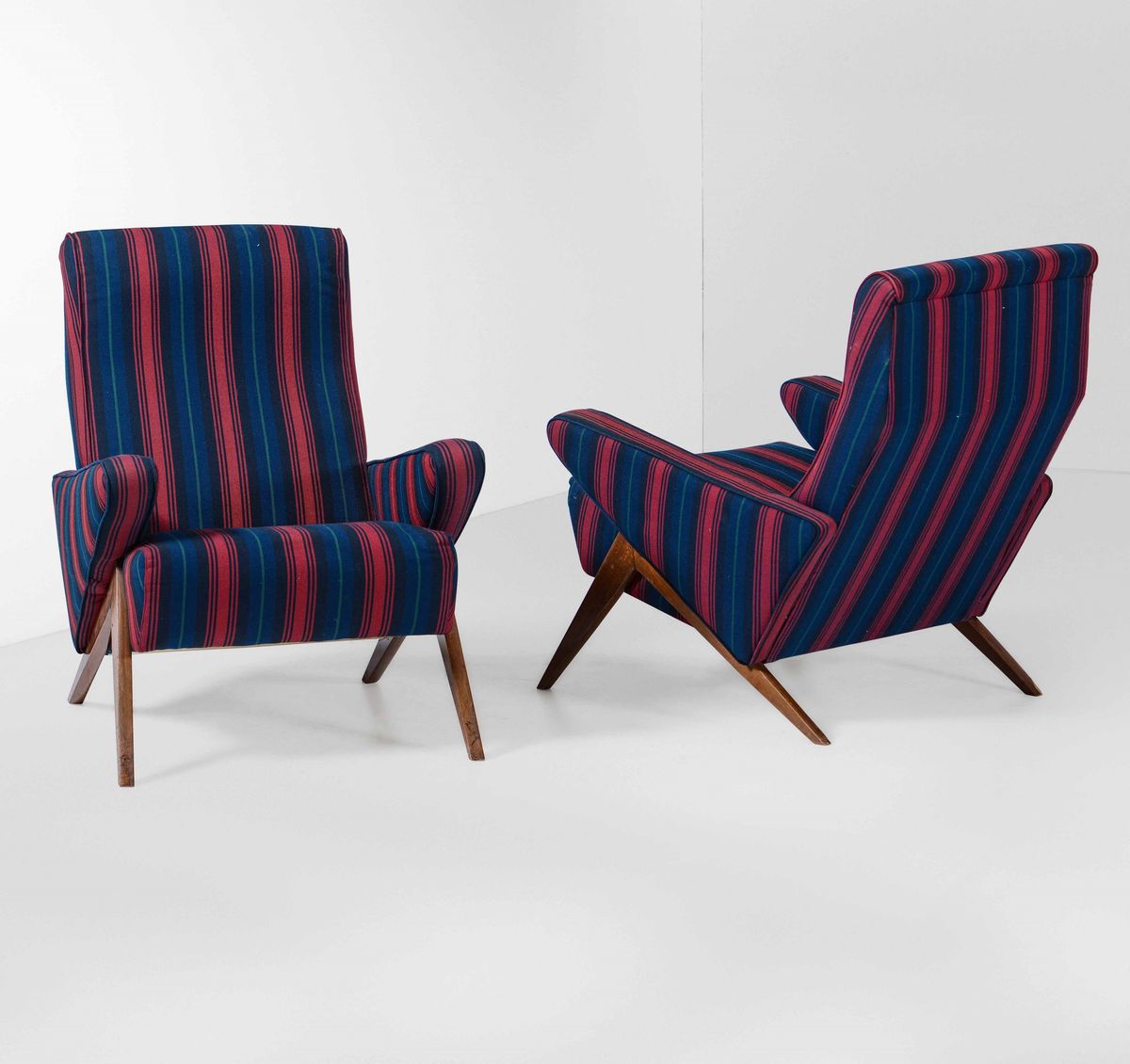 Due poltrone con struttura in legno e rivestimenti in tessuto.