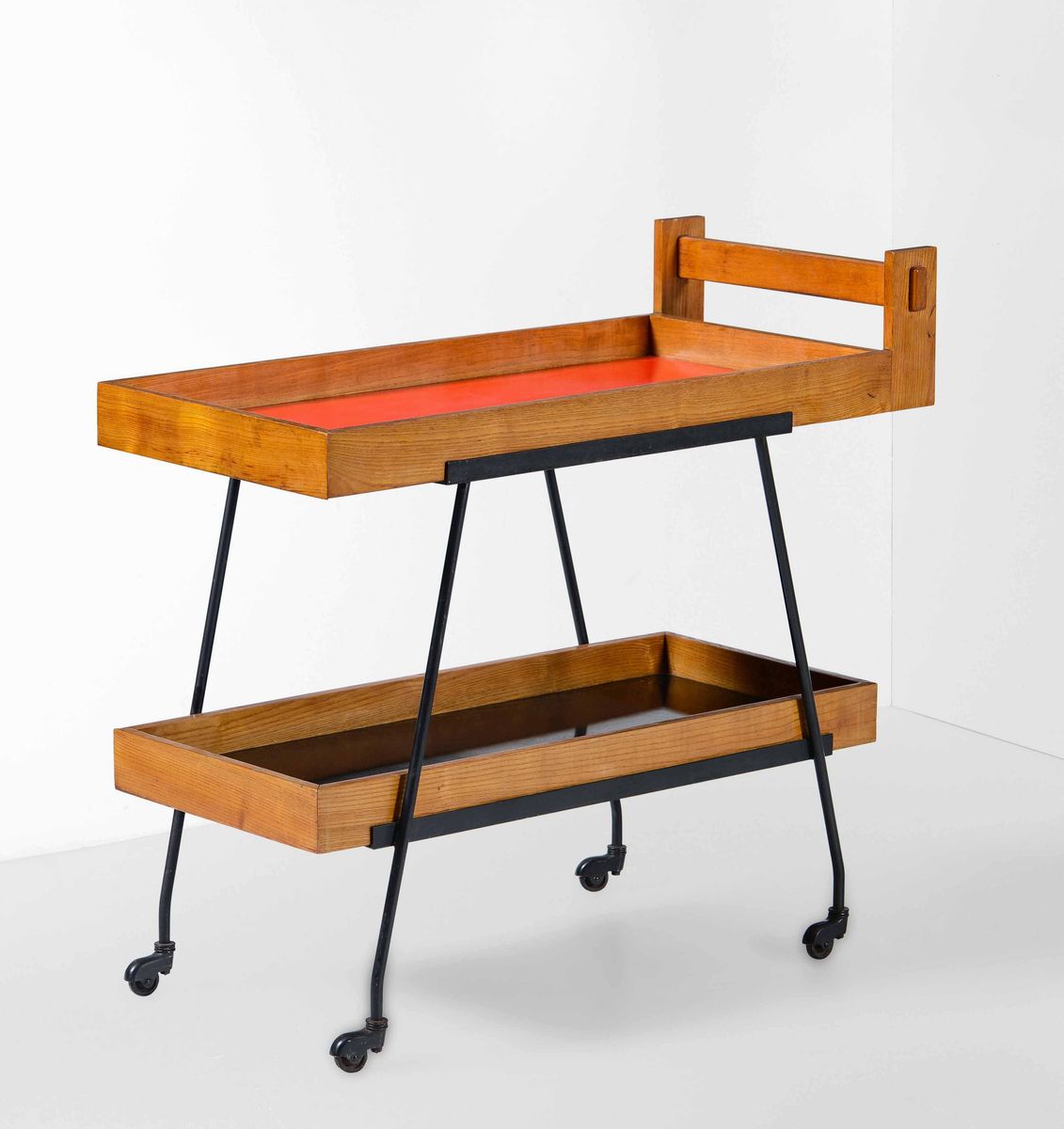Carrello portavivande con struttura in metallo laccato, legno e legno dipinto.