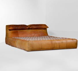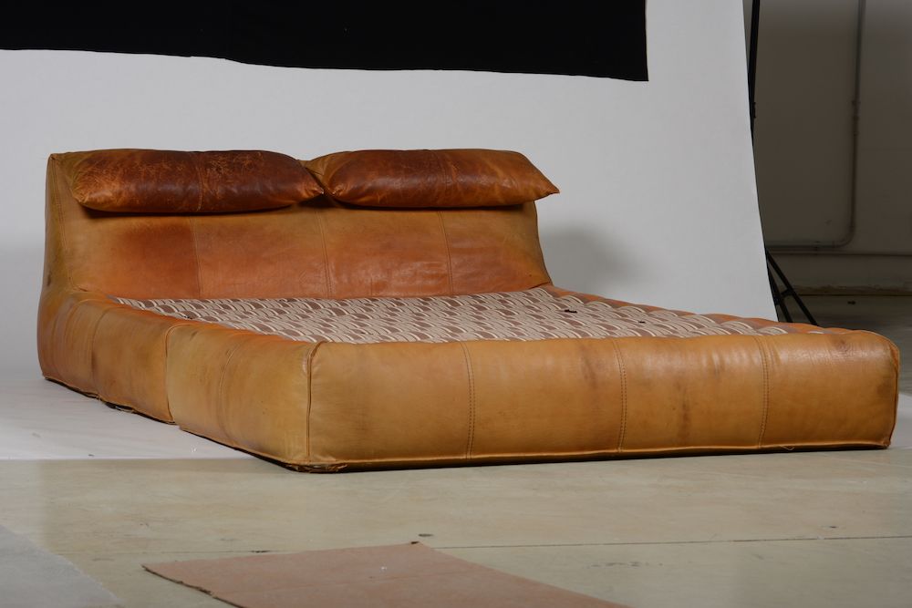 Letto matrimoniale mod. Le Bambole rivestimento in pelle e tessuto.