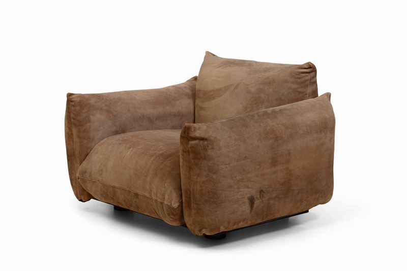 Divano e poltrona mod. Marenco con struttura in metallo e rivestimenti in pelle scamosciata.