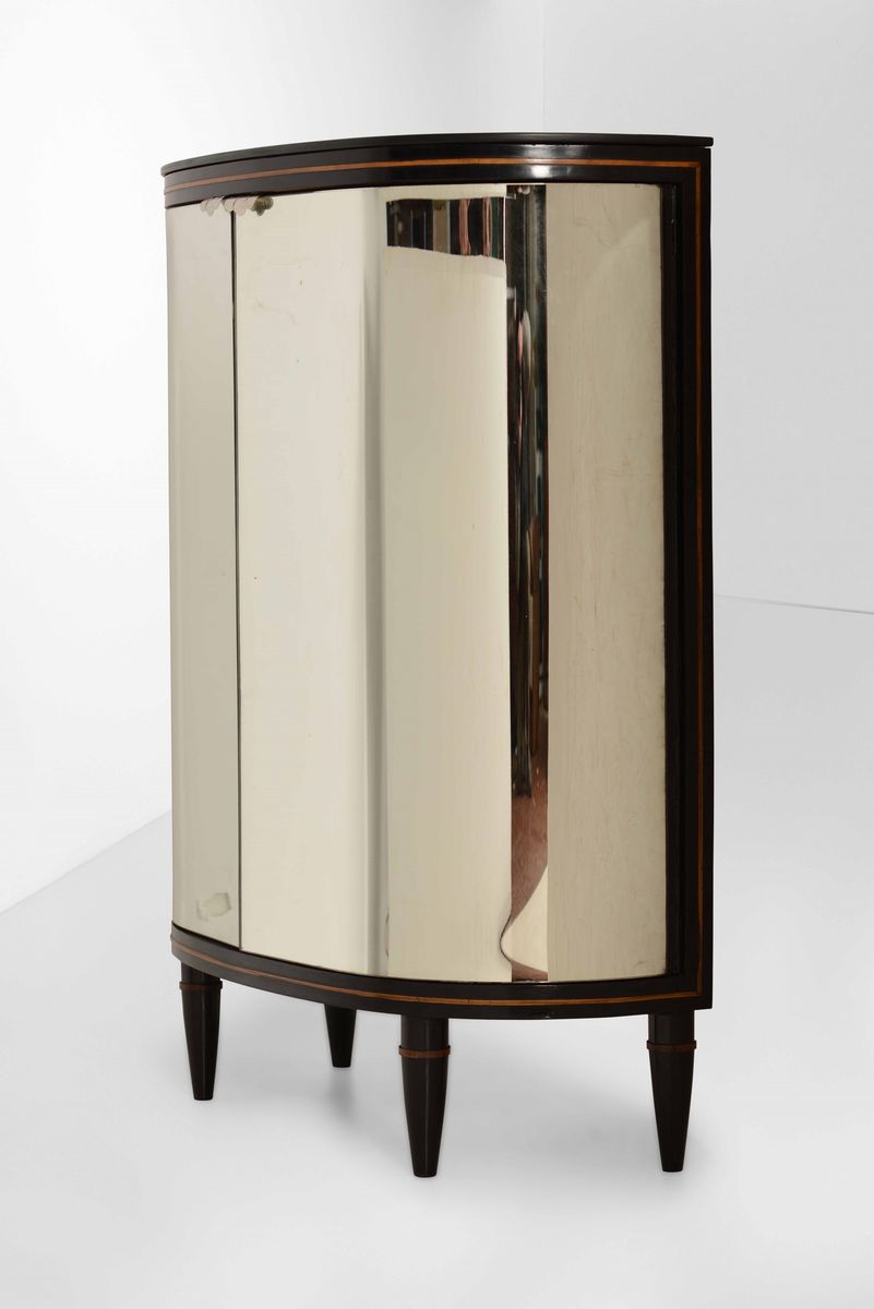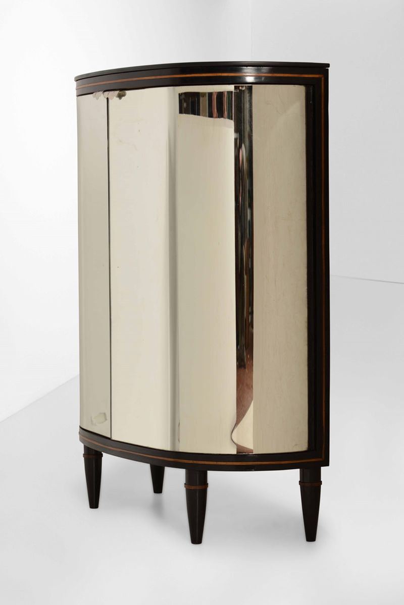 Mobile bar con struttura e sostegni in legno e rivestimenti in vetro specchiato.