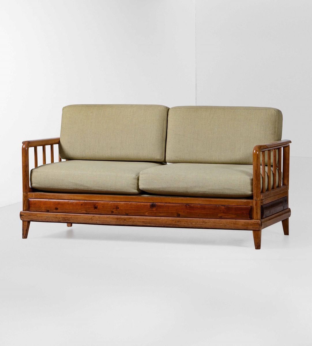 Divano con struttura e sostegni in legno. Rivestimento in tessuto.