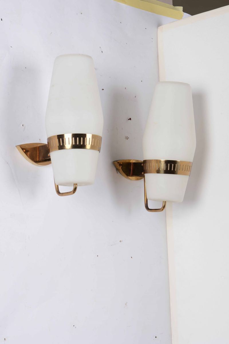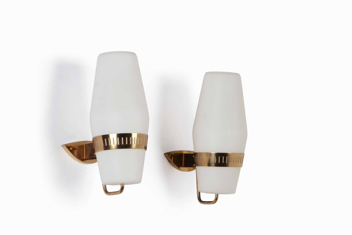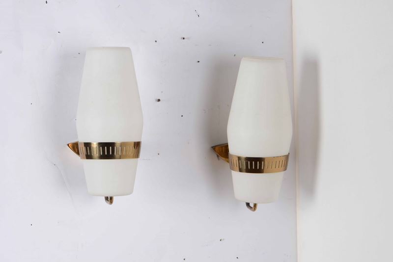 Coppia di lampade a parete mod. 2078 con struttura in ottone e diffusore in vetro opalino sabbiato.