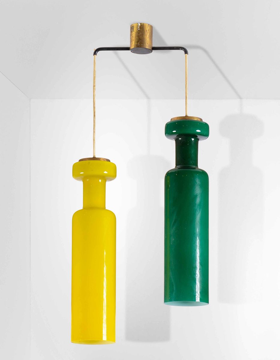 Lampada a sospensione con diffusori in vetro incamiciato colorato e particolari in ottone.