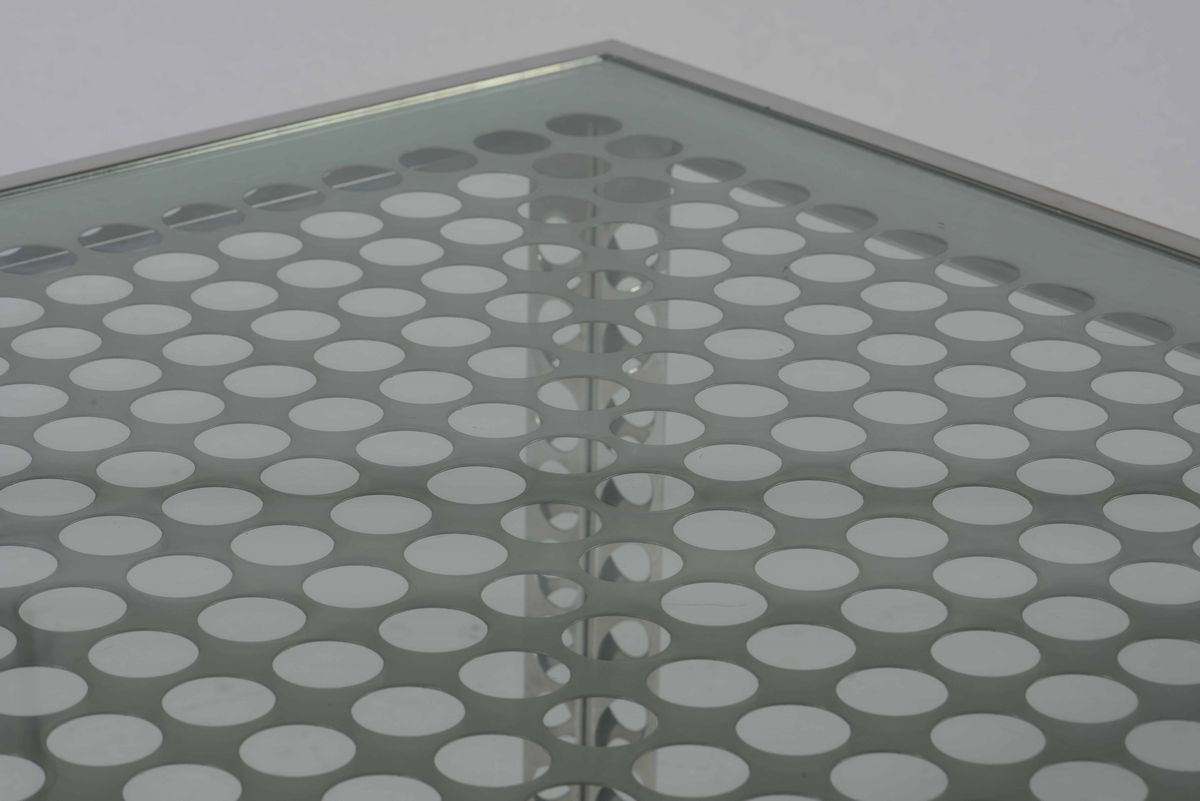 Tavolo con struttura in acciaio traforato e piano in cristallo.